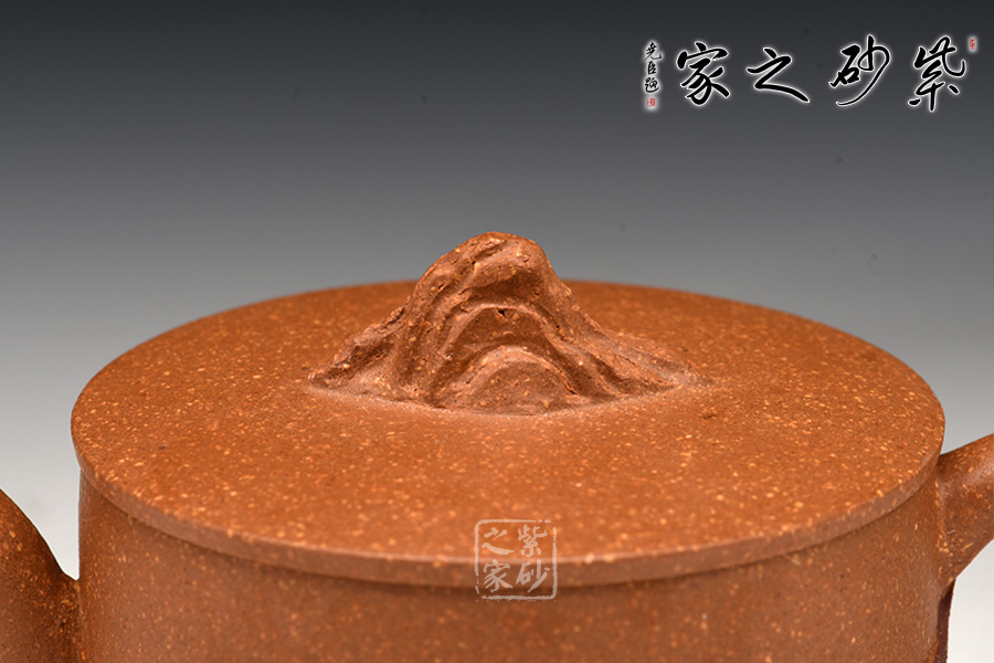 此壺的流嘴、壺把也是非常貼合整體的氣質(zhì),平蓋之上的石堆形鈕別致有趣,捏拿方便的同時,更是自然之趣的體現(xiàn),所謂荷花魚塘、山石流水,美景頓顯。