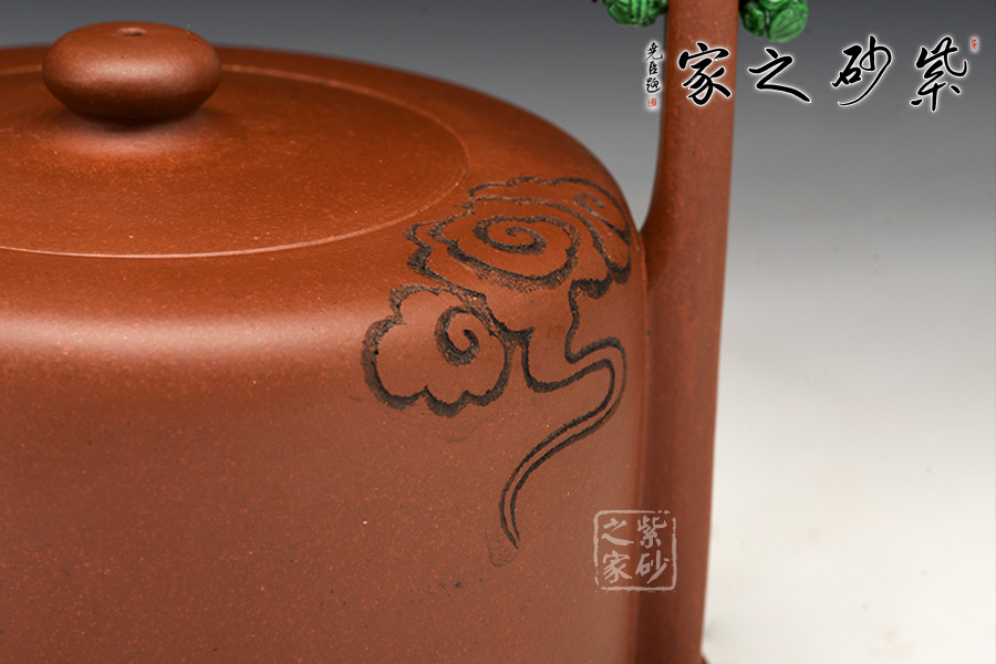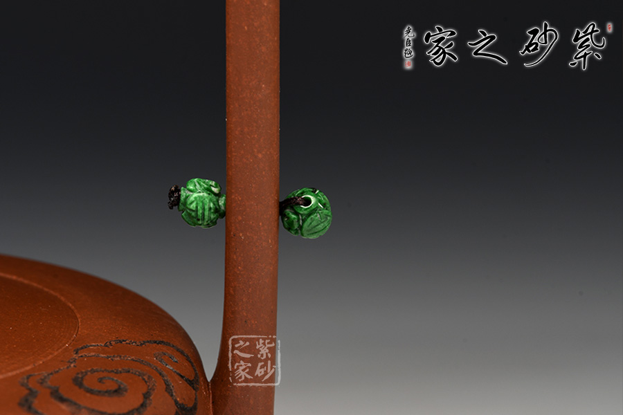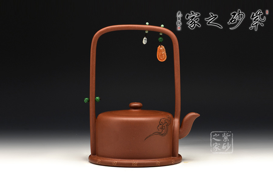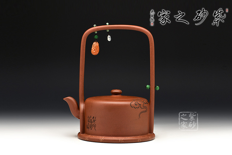 彩云追月提梁這把壺,用玉石來(lái)表現(xiàn)月亮及夜空中繁星的晶瑩剔透感,與壺身上祥云造型的圖案遙相呼應(yīng),高懸的寶石與提梁虛實(shí)結(jié)合,遠(yuǎn)看猶如一幅彩云追月圖。