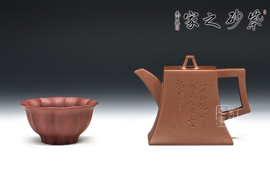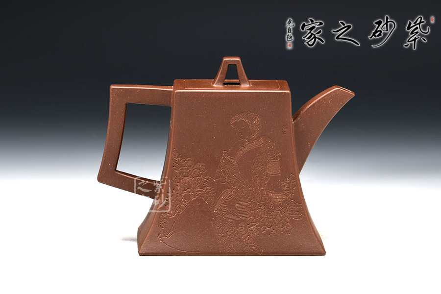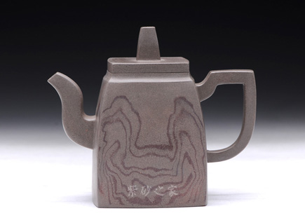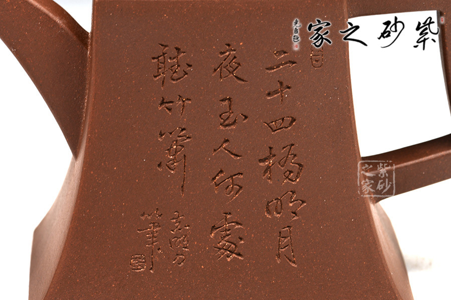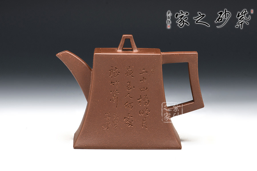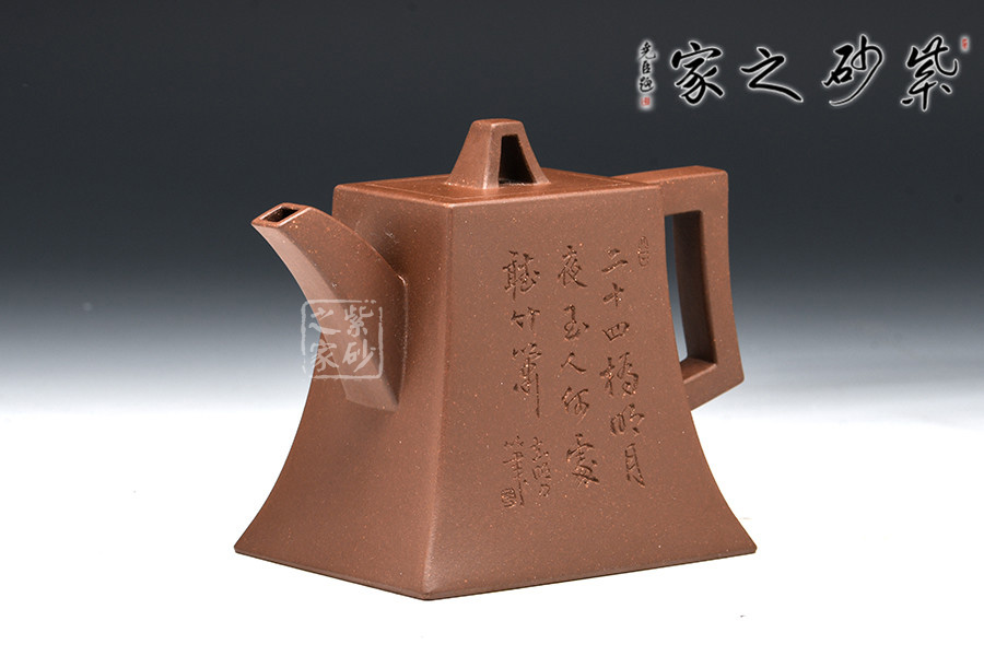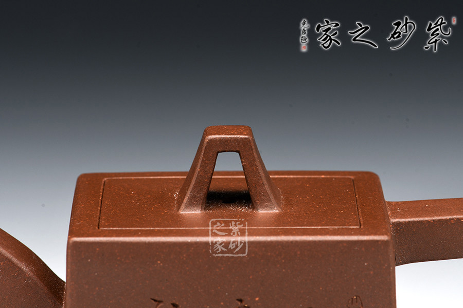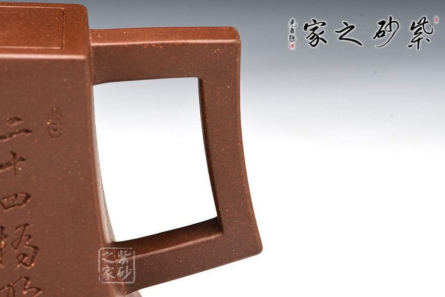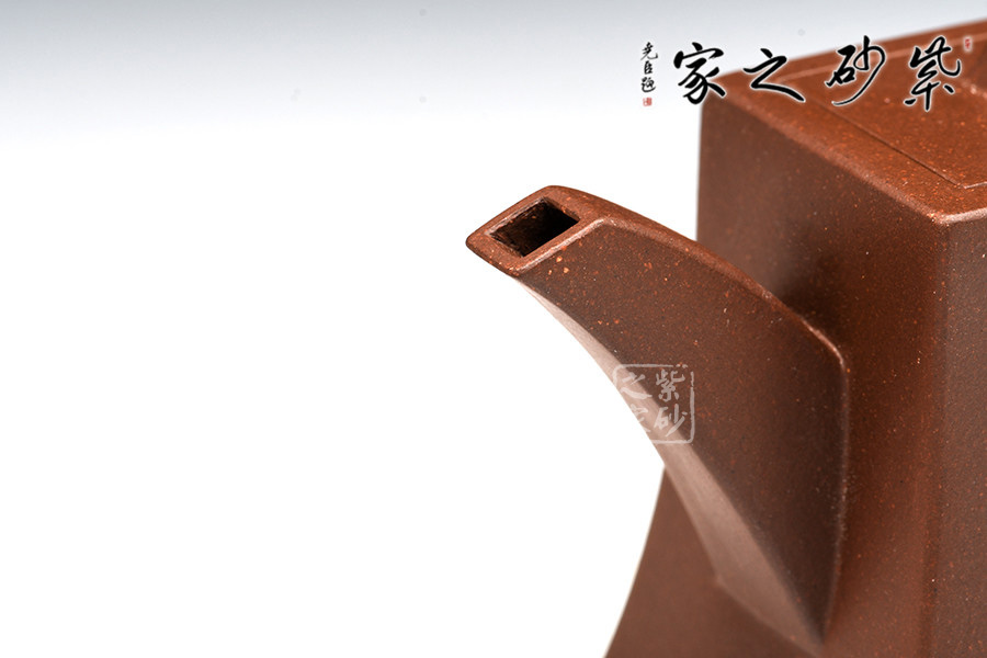 壺身四面相接,由上俯看,壺面正方,側(cè)看,壺的四棱帶有弧度,壺身由上至下逐漸外張,形成鐘口開放的效果,與之對應(yīng),壺鈕的形狀也是上收下放,高而中空,形似鐘鈕。壺流、壺把也俱為四方,但是把端和流口作出起伏的流線,使整體造型生動而不死板。