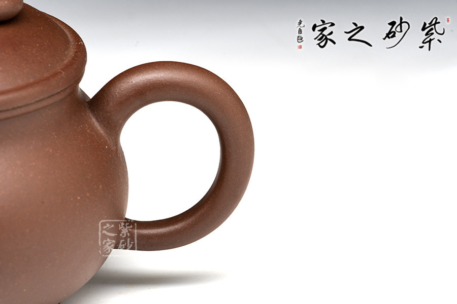 此壺整體圍繞“圓、闊”,造型簡約,觀之喜人。亮點(diǎn)在于橋型鈕內(nèi)圈一圓環(huán),靈動(dòng)輕巧別致。