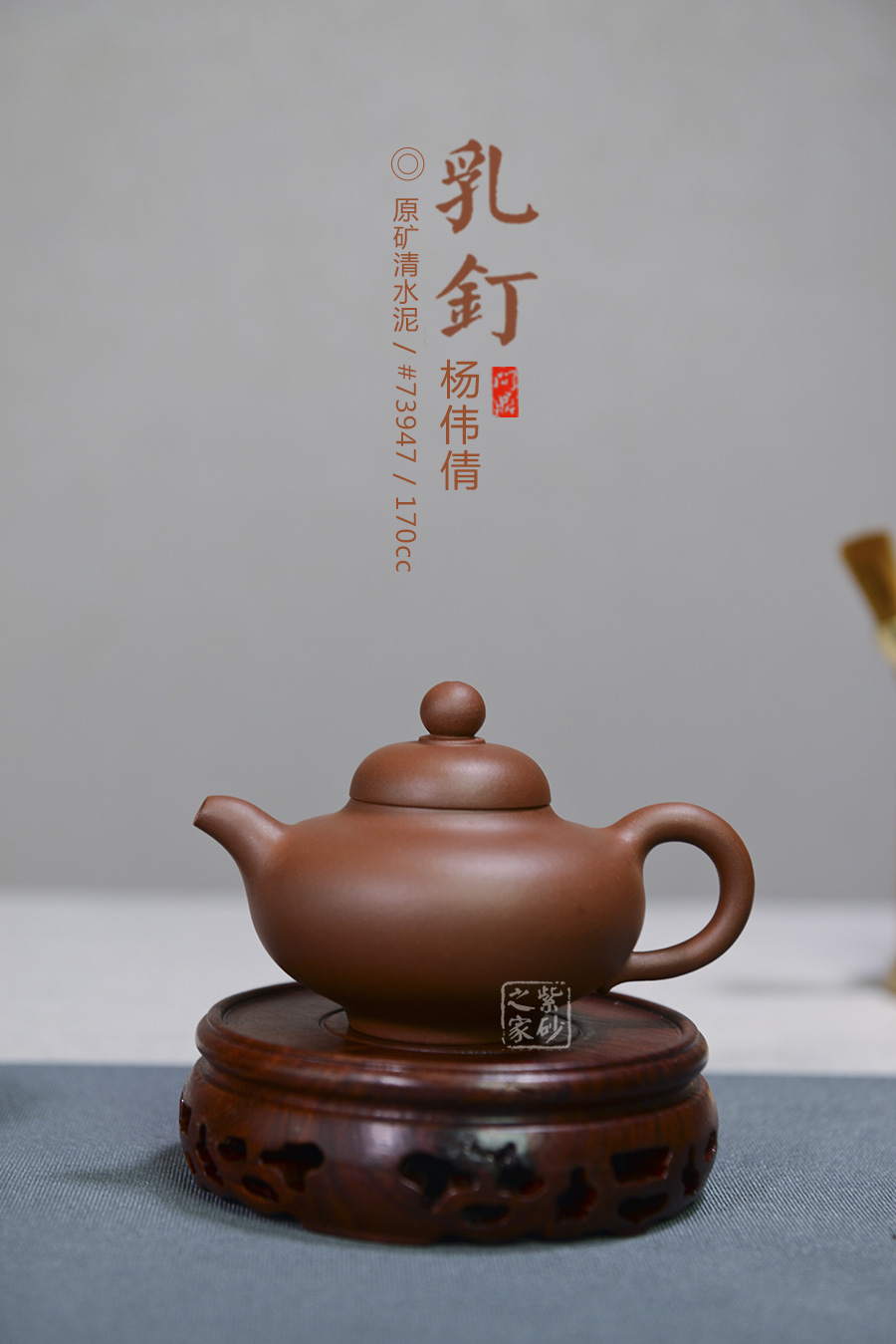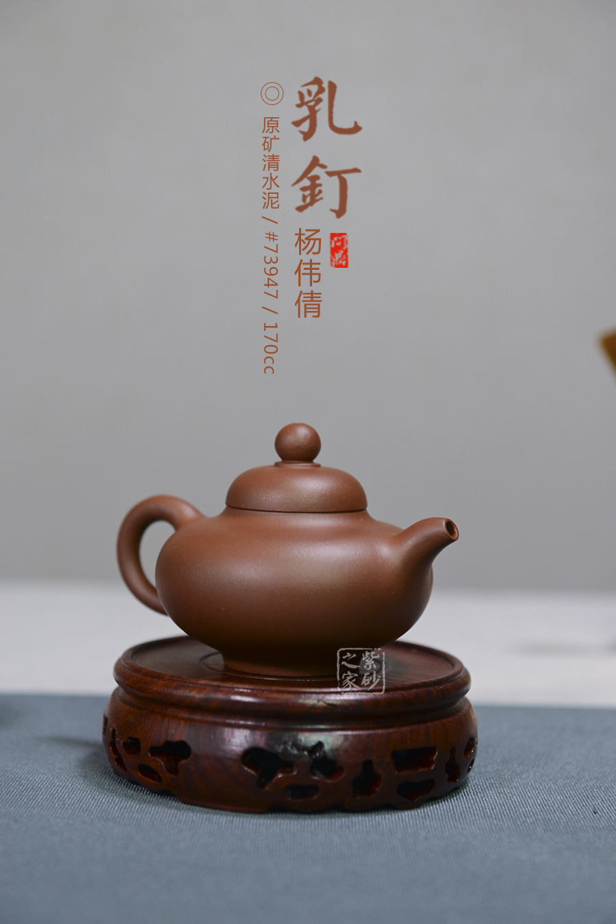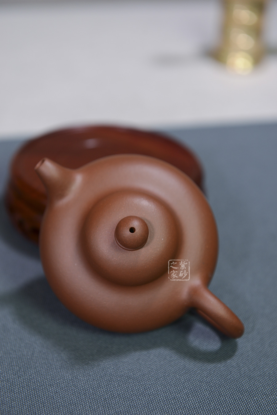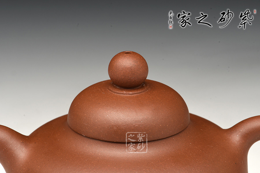 壺呈圓腹、中間寬上下收,短曲流、環(huán)狀柄,高聳蓋、乳鼎鈕。整壺豐滿圓潤(rùn),線條挺括流暢,色澤溫潤(rùn)細(xì)膩。