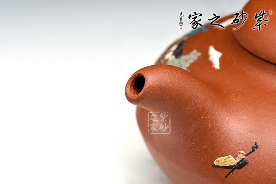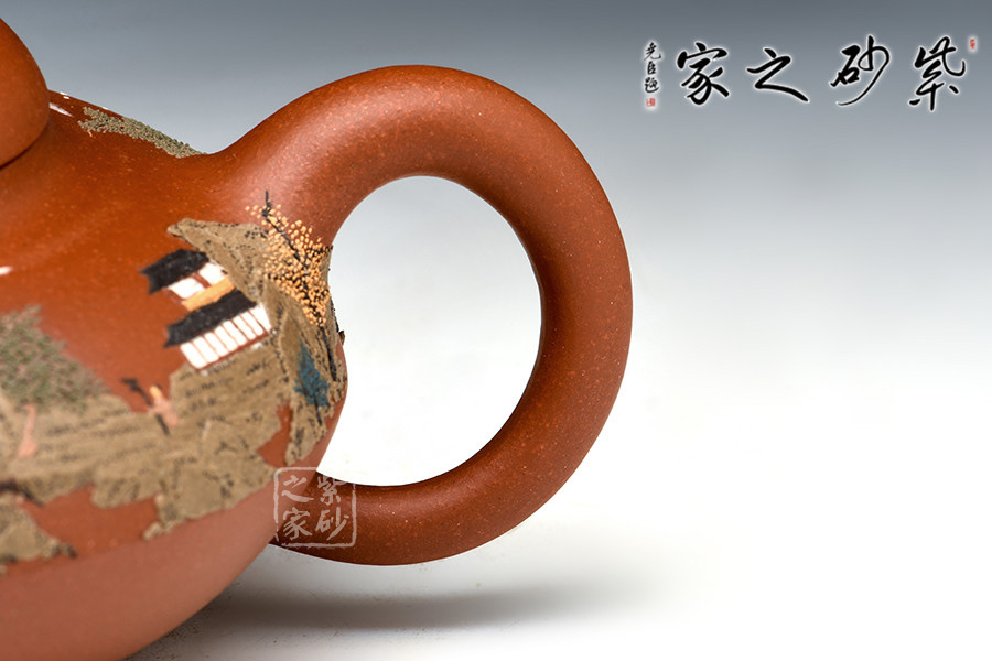 壺體周身細(xì)繪山水書畫,通過不同的筆墨、色彩來展現(xiàn)山水,筆法細(xì)膩,惟妙惟肖,山水布局精妙,泥繪用色濃淡相宜,讓人如臨詩詞古人之境。