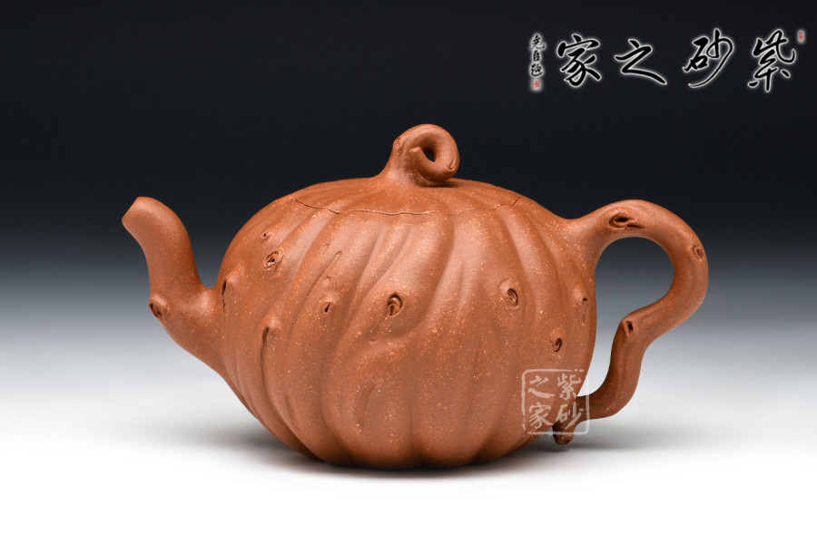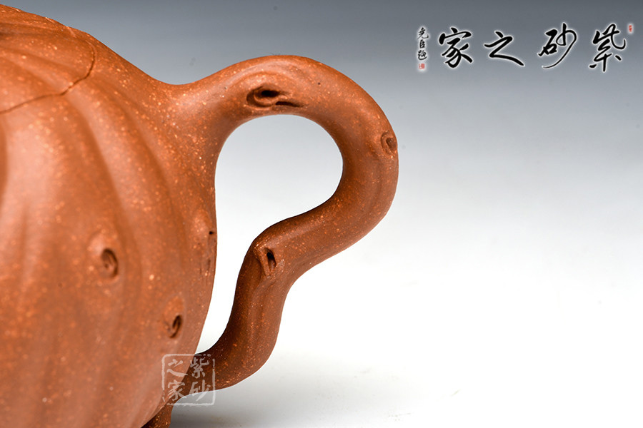 此作取法自然,壺身癭瘤滿布,以枝梗為流把,彎流敦實,出水流暢,握把舒適,彎繞自然。嵌蓋與壺身渾然一體,其上枝莖形鈕別致精巧,曲度逼真,整器樸拙率真。