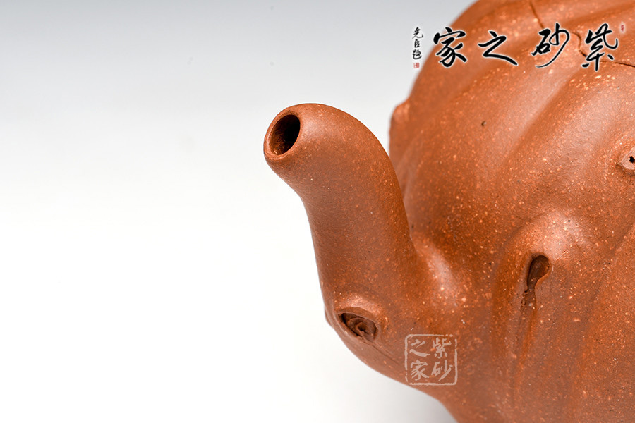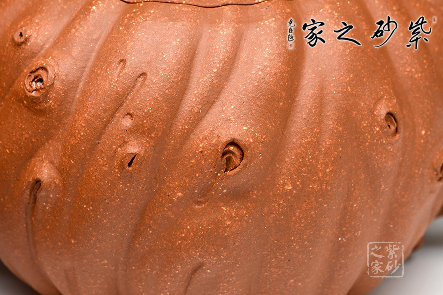 泥性:原礦因含緞泥、紅泥、紫泥等諸多共生礦,陶之后,于深沉之“橙紅色”底上,滿佈五彩斑斕的粗細、深淺之紅、黃星斑點。