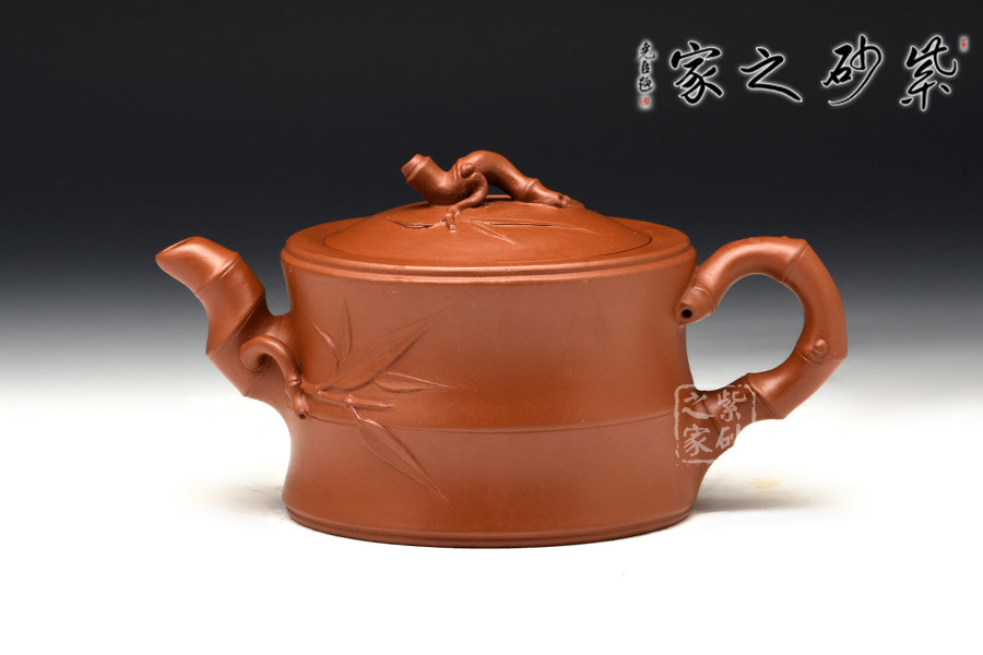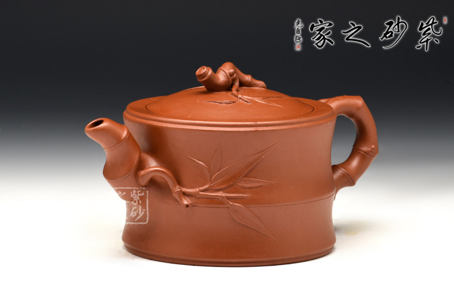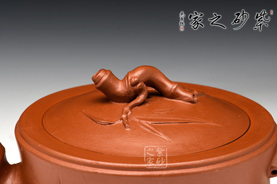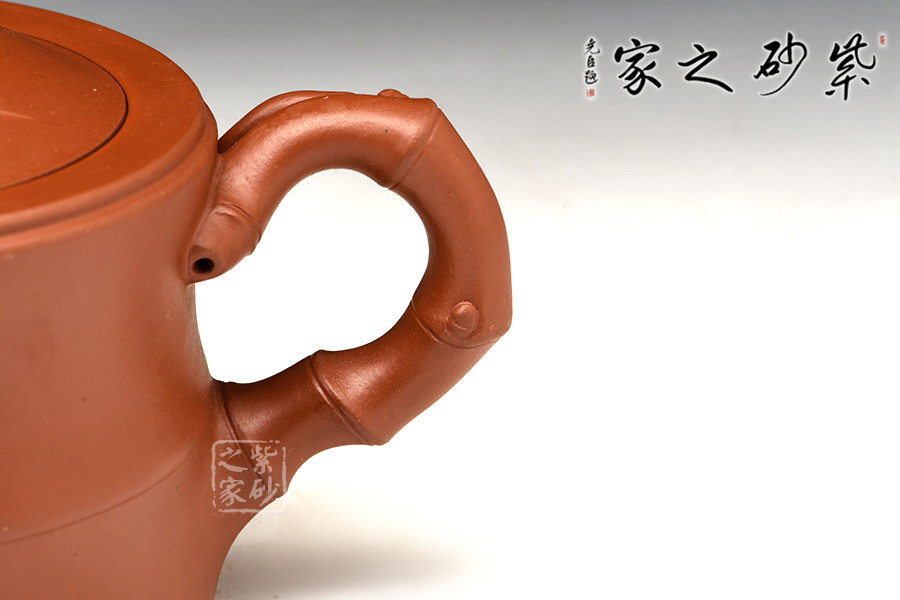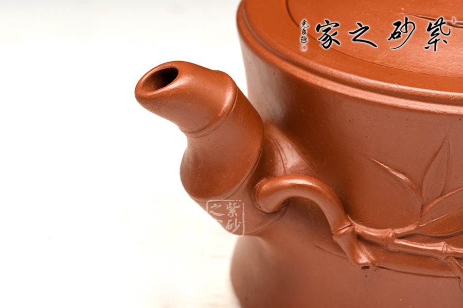 壺身為大段竹節(jié),力道十足;竹節(jié)成彎流自壺身出,硬朗質(zhì)樸,流底部有新葉長(zhǎng)出,附于壺身,竹葉青翠,紋理清晰;嵌蓋設(shè)計(jì),氣密性極佳;小段竹節(jié)彎曲成鈕,形態(tài)自然,有新葉自然長(zhǎng)出,顯示勃勃生機(jī);竹段成彎把,虬勁有力,把執(zhí)適手。