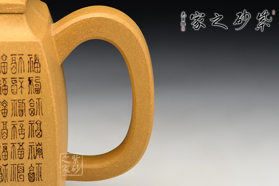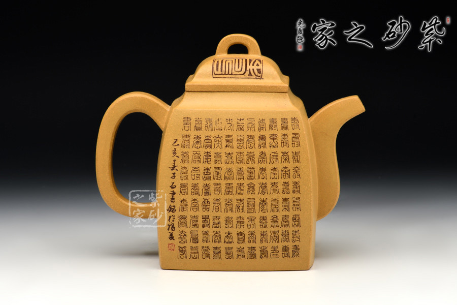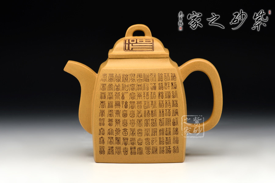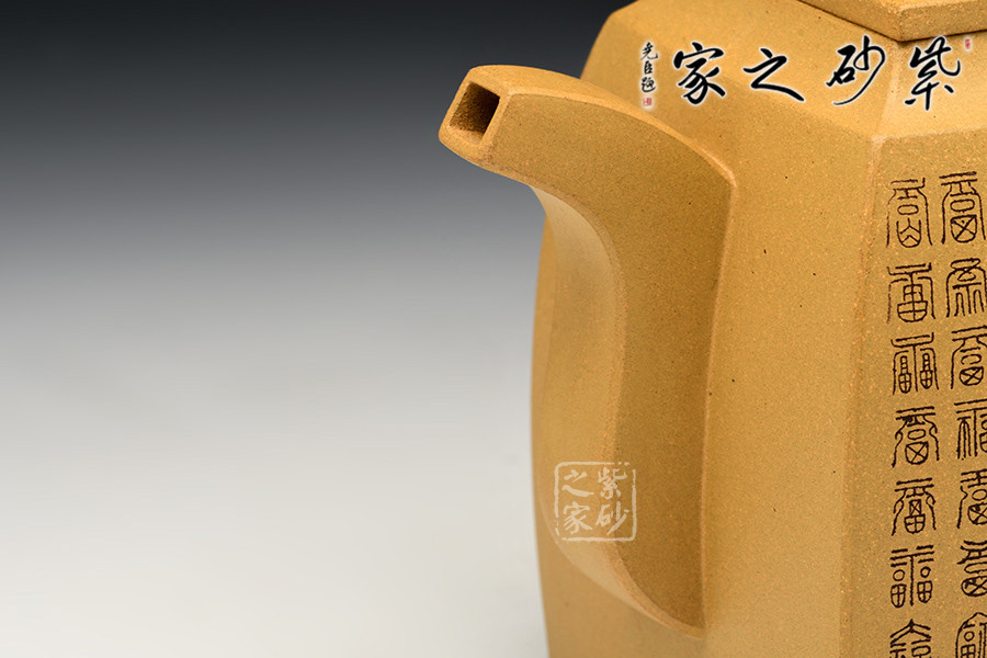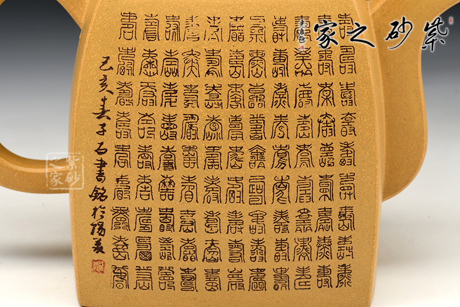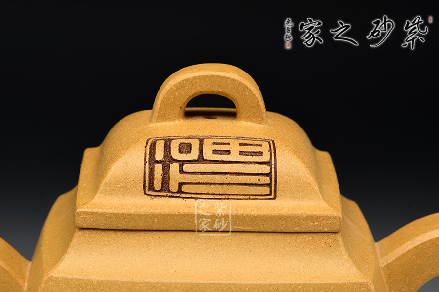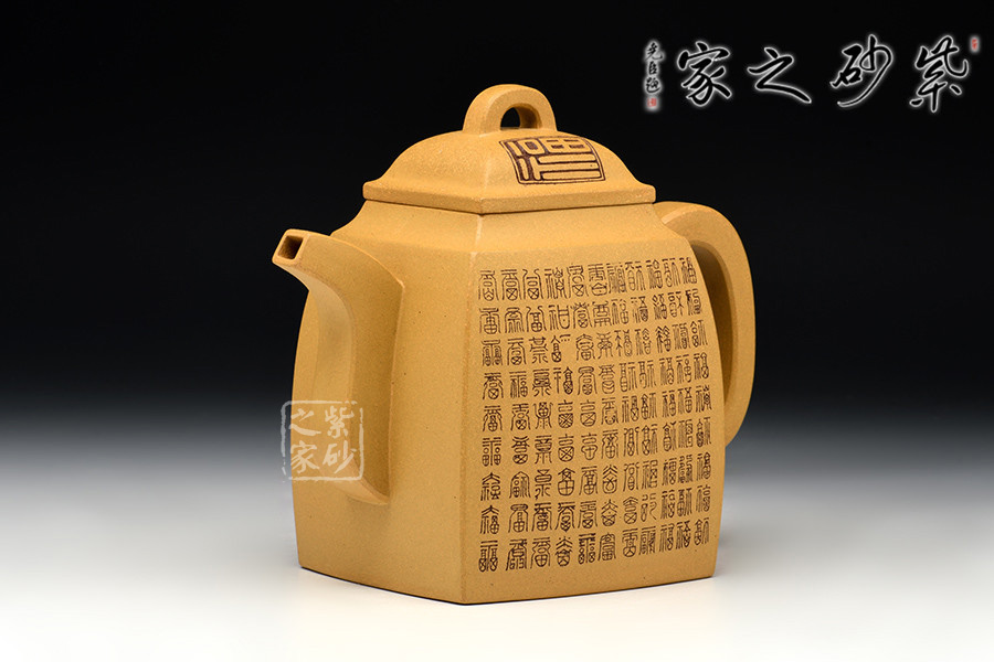 此作壺身為高四方,上部收分小,下部收分大,四棱作圓化處理。斂口,短頸,直腹微侈。四注式壓蓋,弧形橋式鈕。扁環(huán)狀把,管狀流,流體四分之三平貼壺身,此壺整體型制精雅而不失古樸韻味。