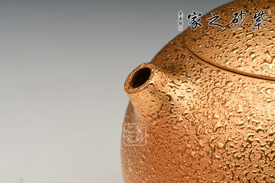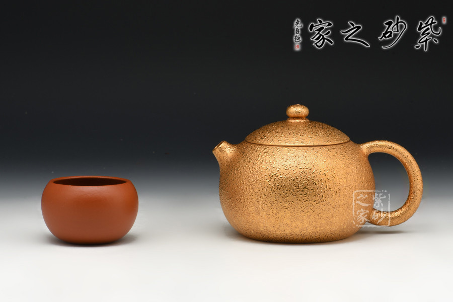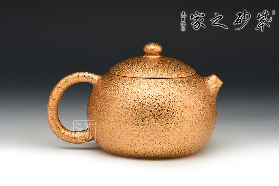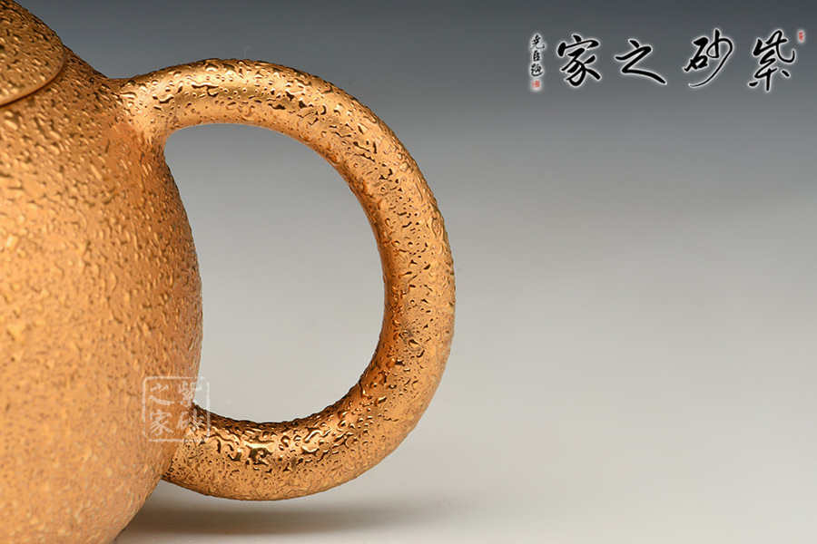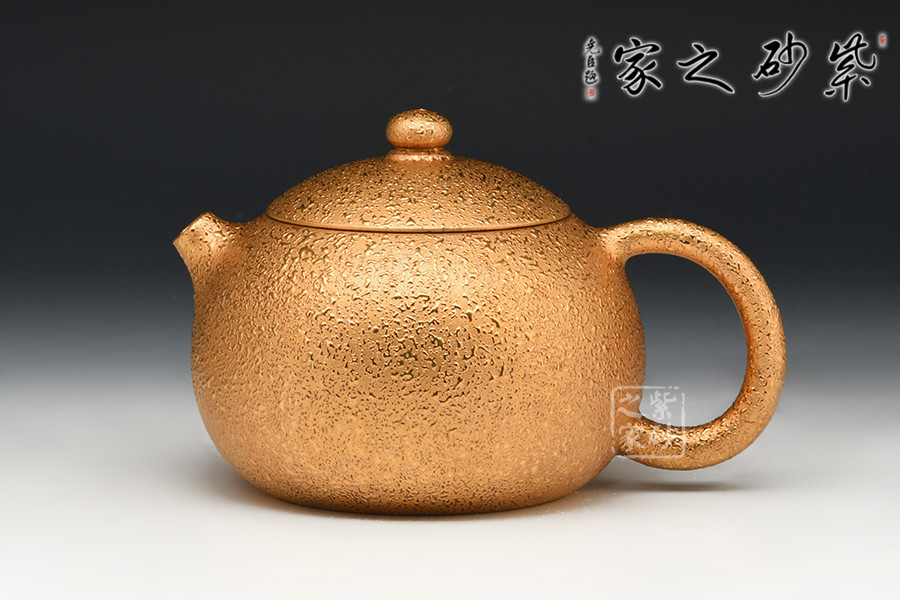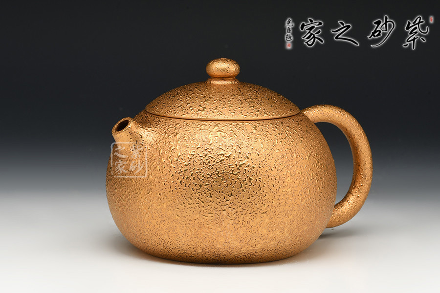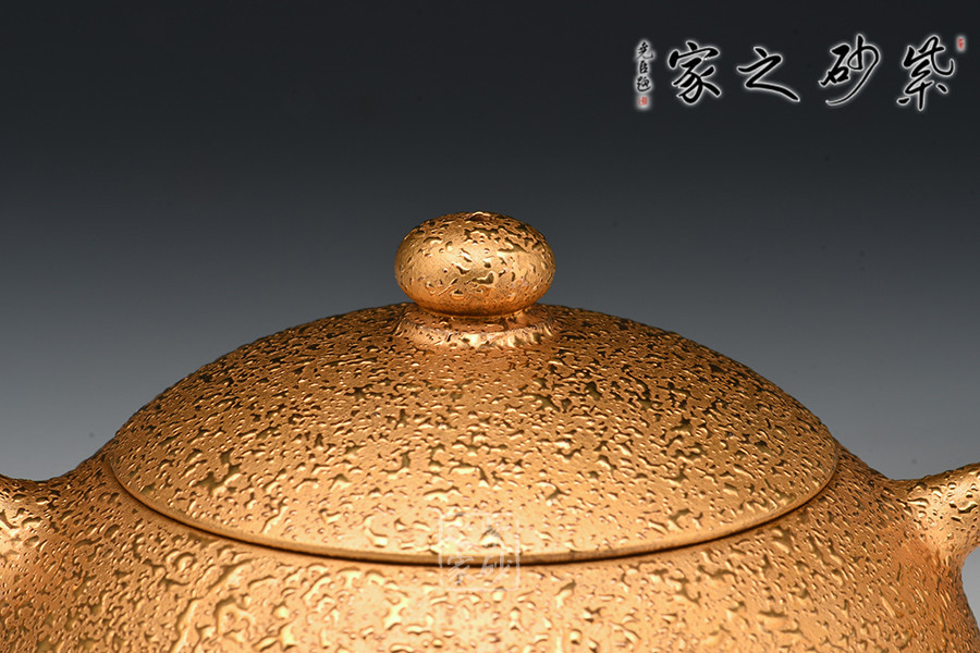 此作亮點(diǎn)還在于壺體通身采用了鍍金的工藝手法,使之看來金光閃閃,引人注目,從而提高紫砂制品的觀賞效果和藝術(shù)價(jià)值。
