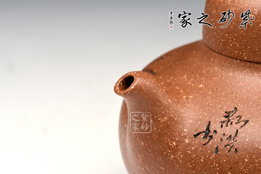 泥性:原礦因含緞泥、紅泥、紫泥等諸多共生礦,成陶之后,于深沉之“橙紅色”底上,滿佈五彩斑斕的粗細、深淺之紅、黃星斑點。