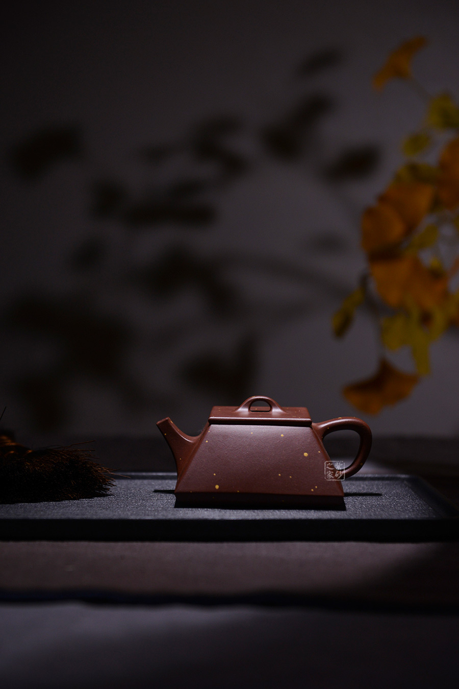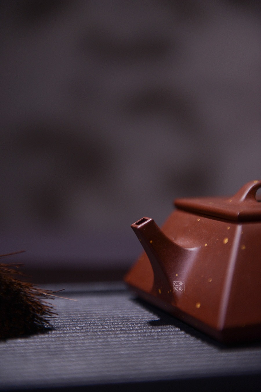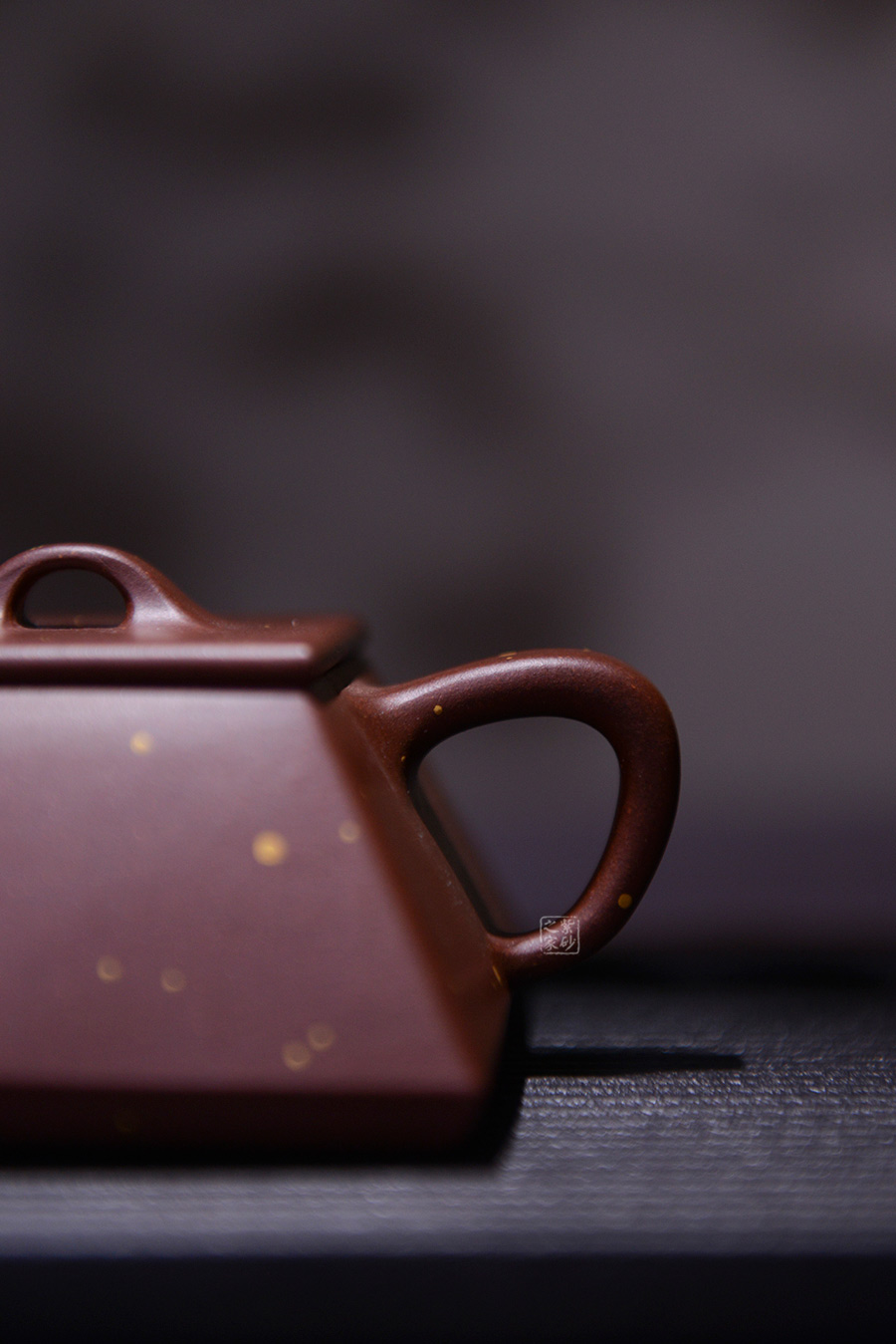 加上點金手法的裝飾,整壺通體金光點綴,在樸拙之外添加了一絲輕靈之感,賞心悅目。