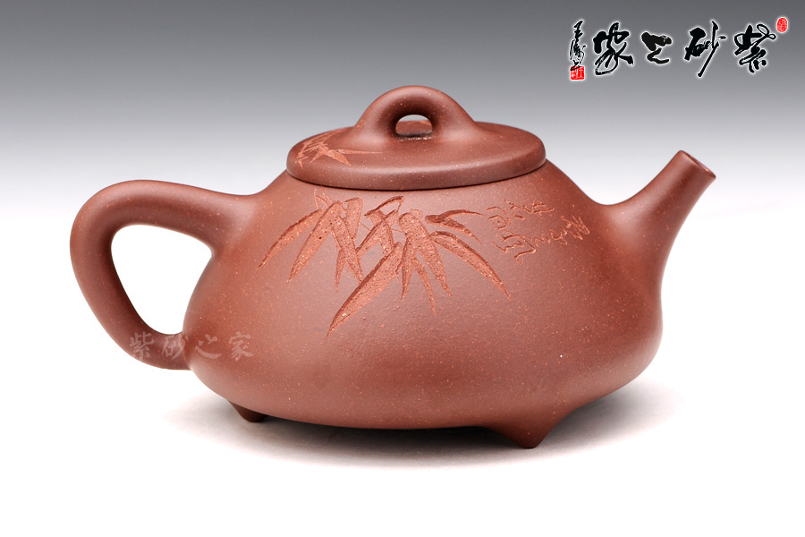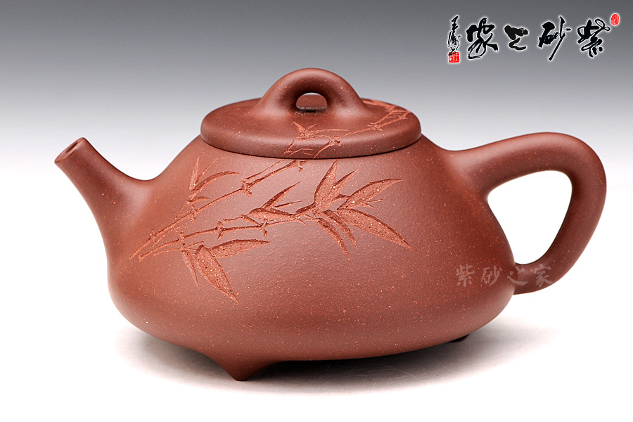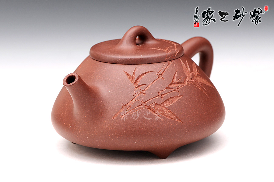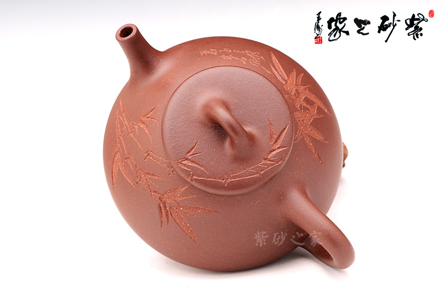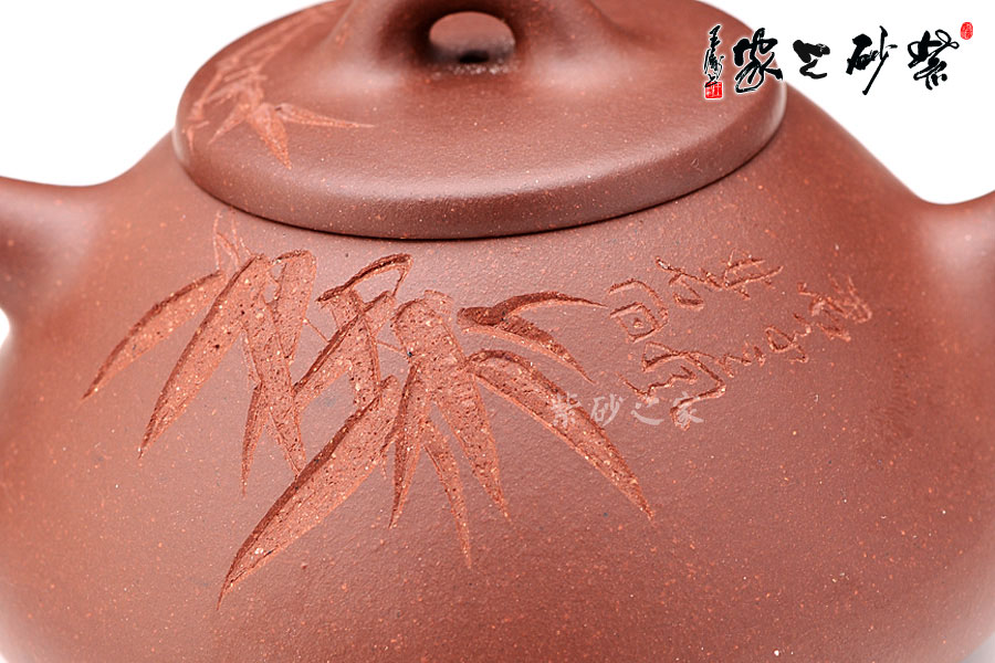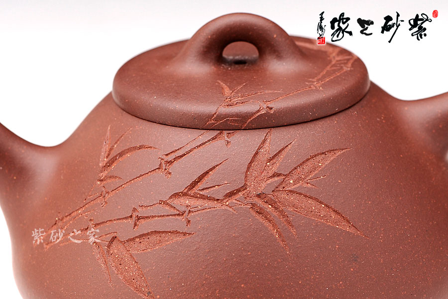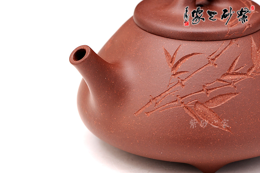 壺身有青竹細刻,韻味尤佳!“人”字型設(shè)計,平穩(wěn)莊重,敦樸厚實。壺嘴長短粗細與整個壺的形態(tài)相一致。手柄遠觀近似三角狀