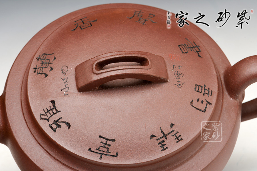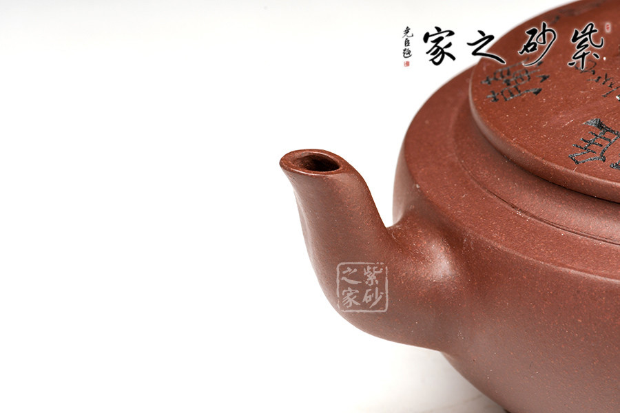 壺身似瓦筒,口大、蓋平似銅鏡,蓋面刻“書聲香蘭雅室琴韻”。嘴彎上揚(yáng),耳形壺把,鈕似橋型,中間鏤空,基于造型法則,在變化中求統(tǒng)一。