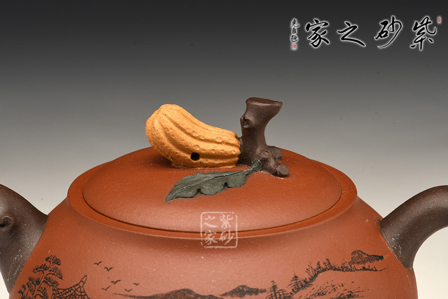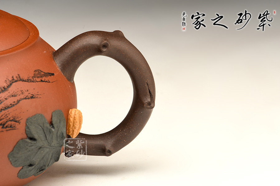 作品整體圓潤,稍扁圓壺,壺腹豐腴,穩(wěn)重大方。嵌蓋與整壺融為一體,緊密留茗香。嘴、把、鈕均呈樹枝形狀,雙色泥工藝,鈕把處還新長出有新葉嫩果,綠葉黃瓜,自然和諧之態(tài),別具美感,體現(xiàn)了作者深厚的裝飾工藝及藝術(shù)欣賞性。