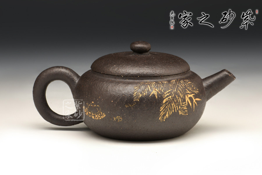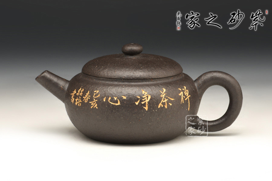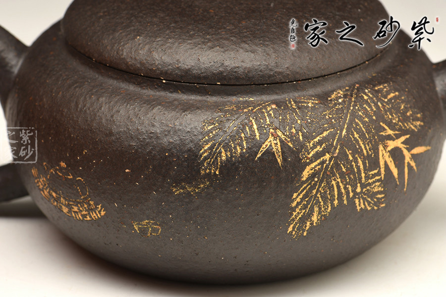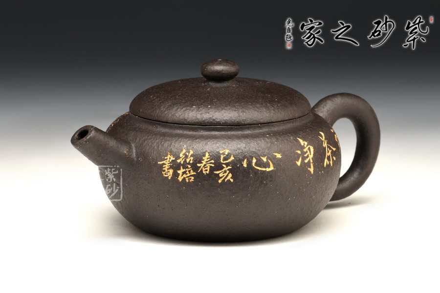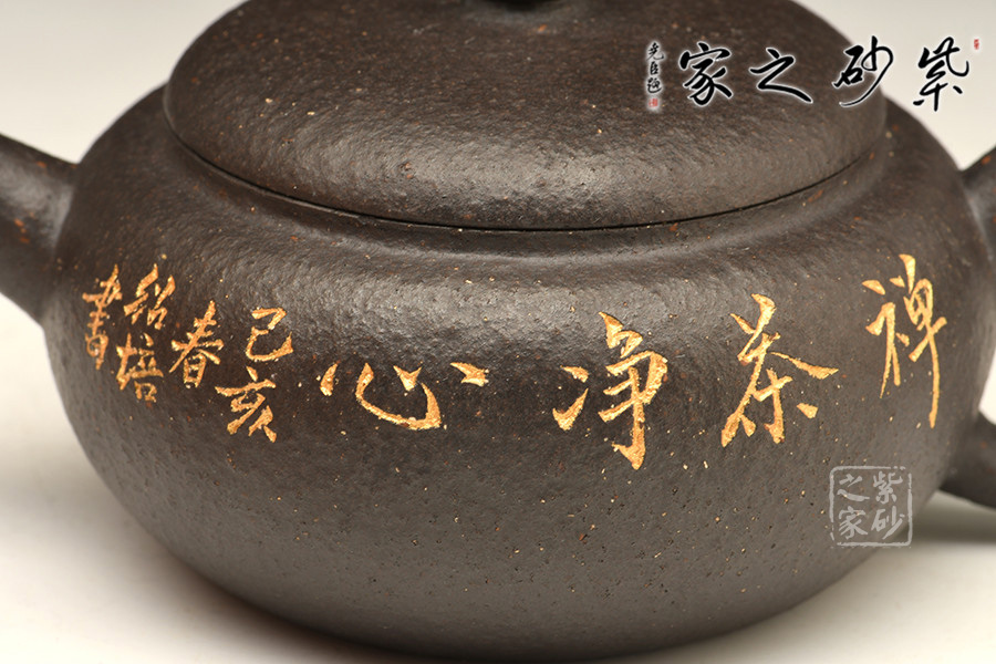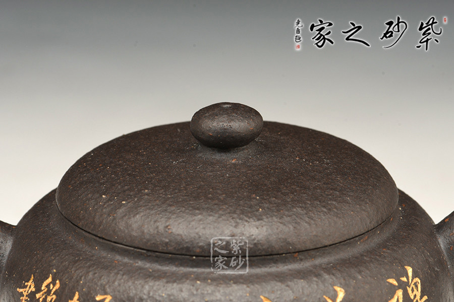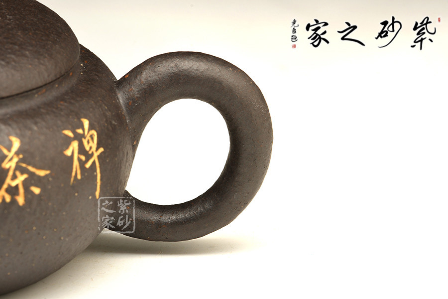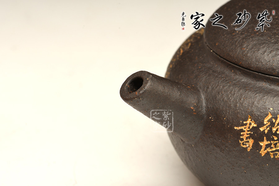 扁圓形豐腴,長直流,出水有力順暢,耳形壺把,形態(tài)優(yōu)美???、流、柄高度一致,搭配和諧。壓蓋寶珠鈕,鈕形與壺身形呼應,珍稀黑鐵星泥作料,極富質(zhì)感,凝重樸實。