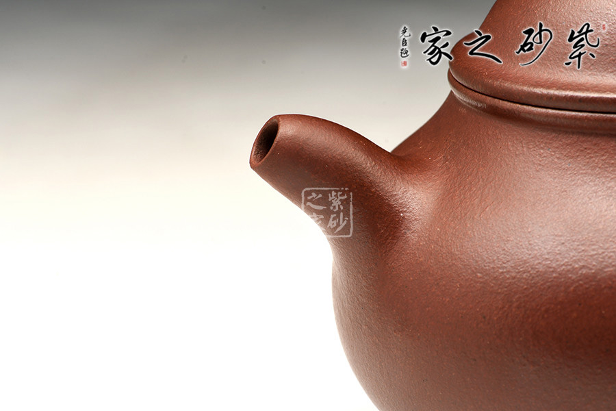 此款高潘壺矮圓的壺身豐實(shí)有力、骨肉亭勻,沉穩(wěn)端重有大氣。彎流挺翹,出水爽利干脆;珠鈕圓潤可人,拿捏適手,壓蓋與壺口緊密,茗香不散;流、把弧度前后相應(yīng),渾厚有勁。把圓而挺括,似乎有循環(huán)不已的動(dòng)勢蘊(yùn)于其中,予人大方雋永之感。