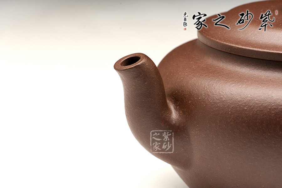 此壺壺體較大,位置矮、扁、沉。壺身渾圓、敦實(shí),下部內(nèi)斂成底,豎頸,與下壓的壺肩形成緩沖。壺蓋扁、滿,口沿寬大,子母線嚴(yán)絲合縫,密不透氣。壺鈕扁圓,彎嘴上揚(yáng),耳形把,整器是紫砂茗壺光素造型中的佳器,看似素面素心,卻顯現(xiàn)出老師純熟深厚的技藝。