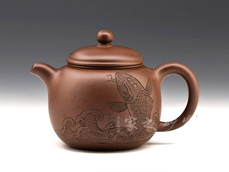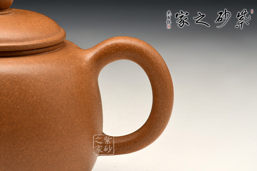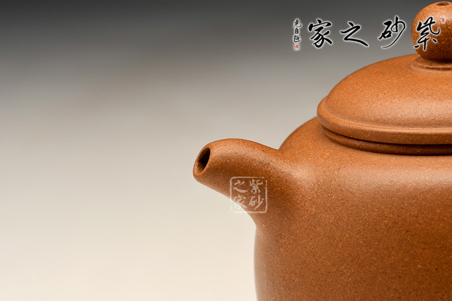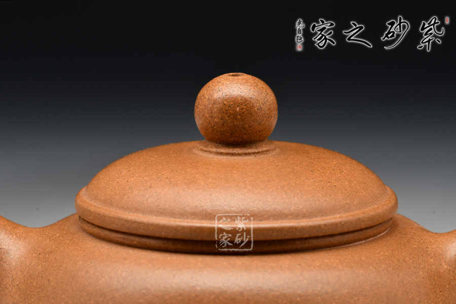 此作造型飽滿,壺蓋微鼓,口沿起厚雙線,上嵌寶珠鈕;短彎流上挺,耳把略上揚(yáng)。壺體骨肉亭勻,古拙素雅,正合品茗人所追求的淡泊明志的意境。
