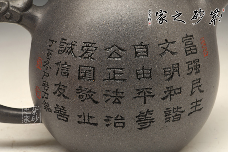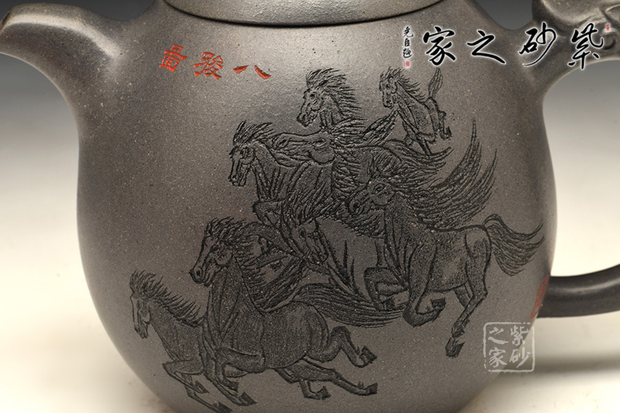 壺身一面裝飾八匹奔騰的駿馬,栩栩如生;一面精銘二十四字社會主義核心價值觀。