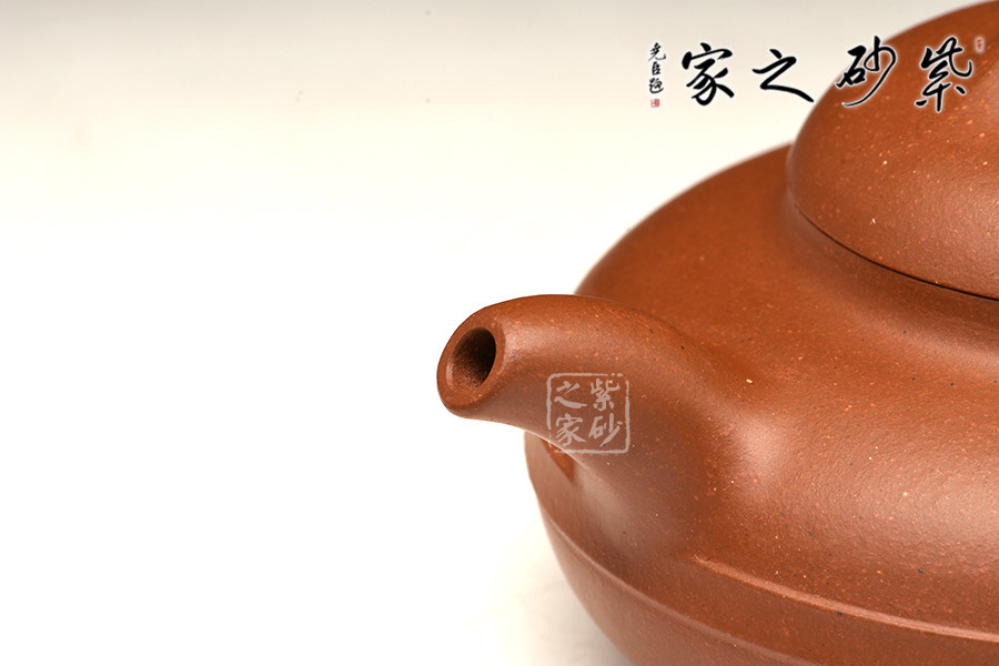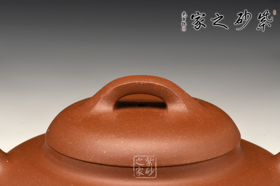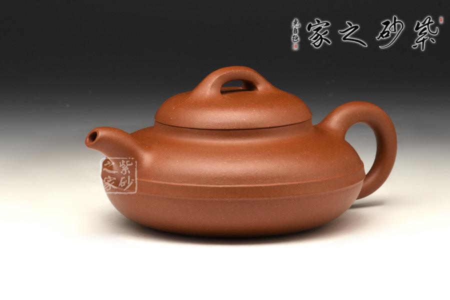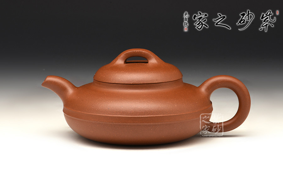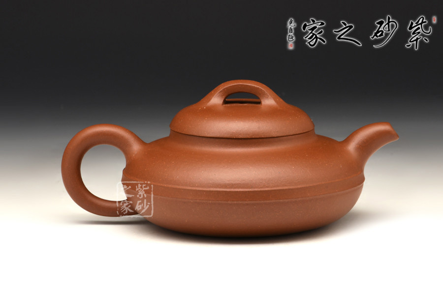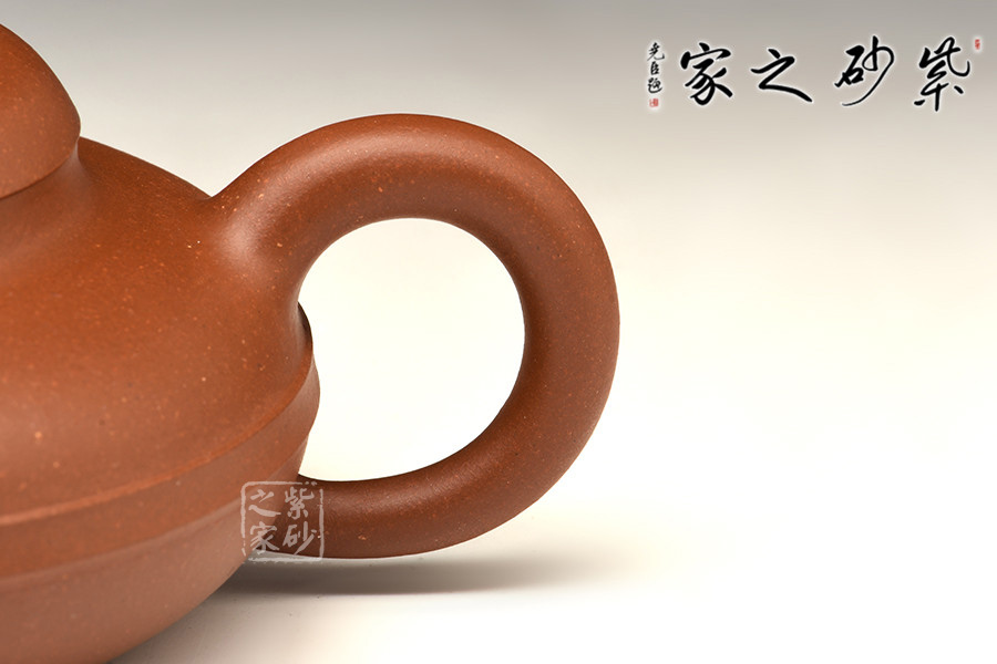 線圓為晚清民國經(jīng)典壺式,壺身用兩泥片合成扁球狀,口部與半球狀蓋相切,壺底簡潔,為一捺底,橋型鈕與蓋渾然一體,整個(gè)壺在扁圓中求韻味。壺流自壺腹延伸自然,把高挑圓潤,與流對應(yīng)稱勢。中置一腰帶線將全壺提攜神韻,變化中求統(tǒng)一,以達(dá)完美。