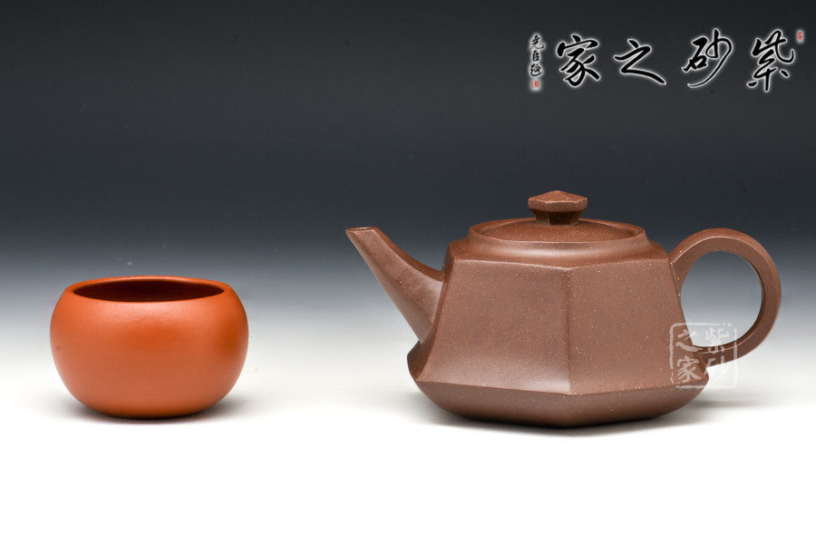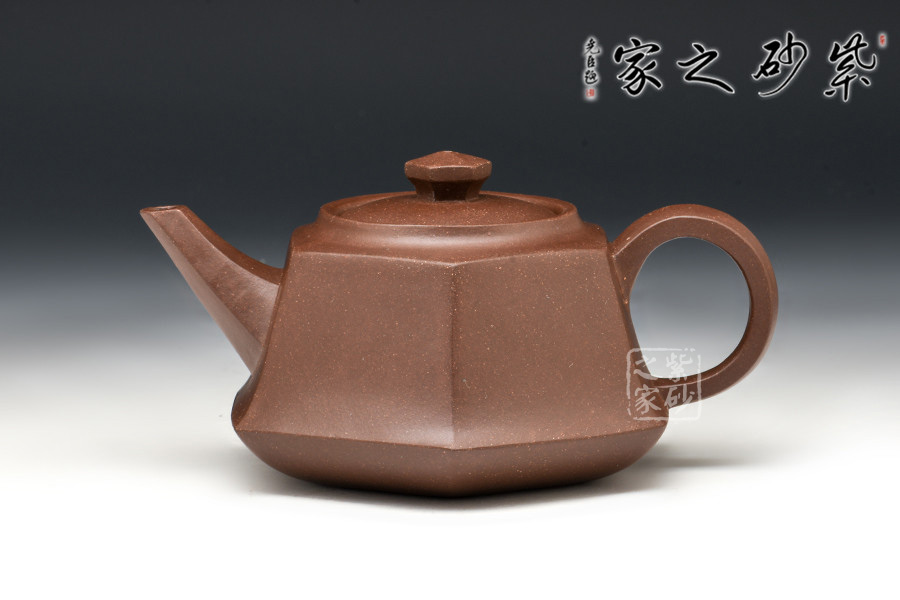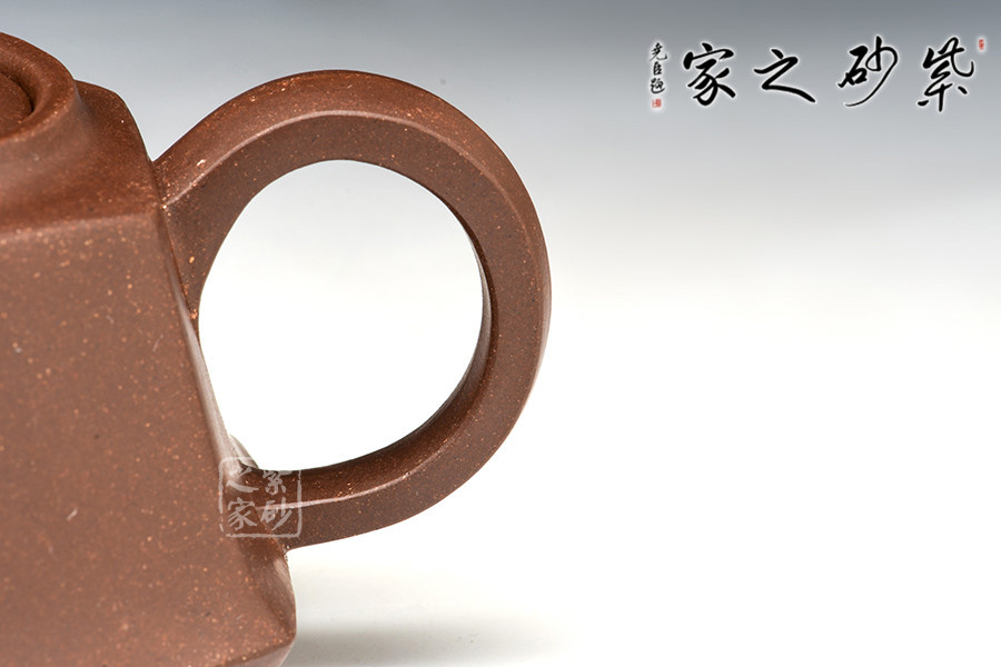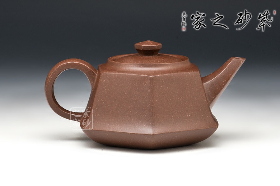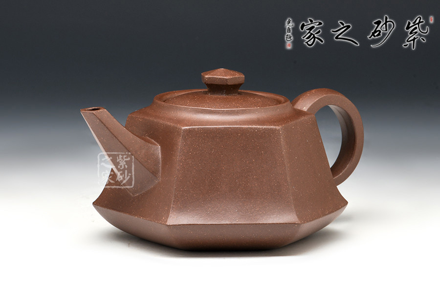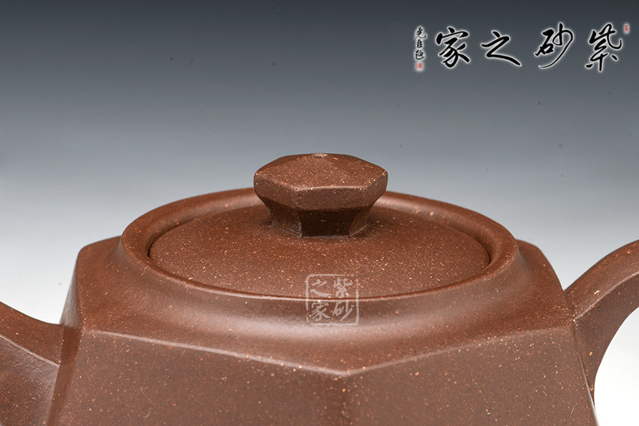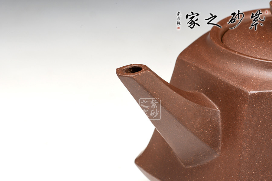 全器自壺身、流、鈕、底、把皆呈六方,曲折合宜尺度,彎流向外胥出,壺鋬過渡流暢。嵌蓋嚴(yán)密,六方狀鈕,結(jié)構(gòu)組合干凈利索,造型雅樸,泥胎砂粒明顯,再加手工技藝純熟,自不同凡響。