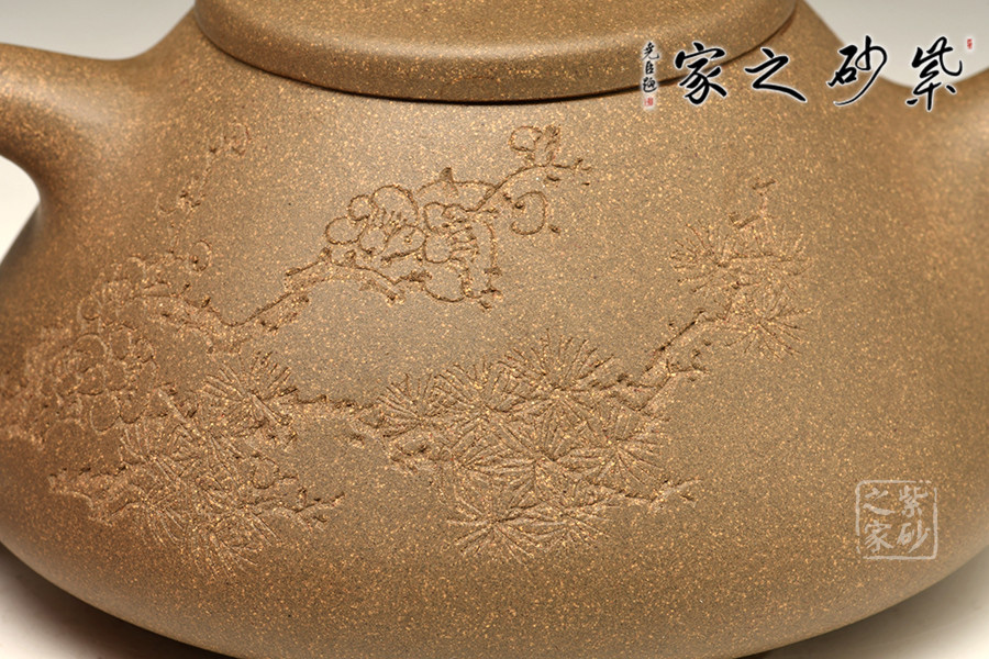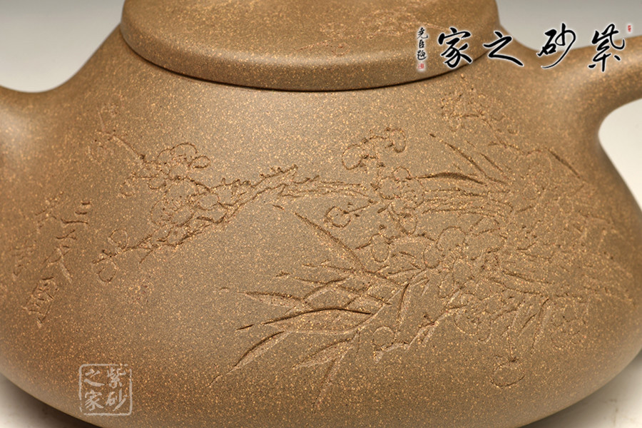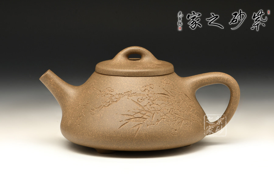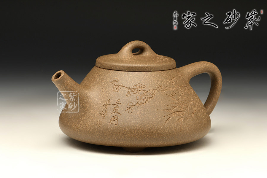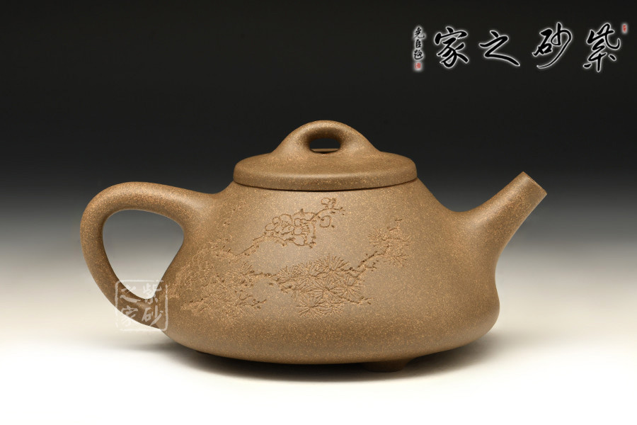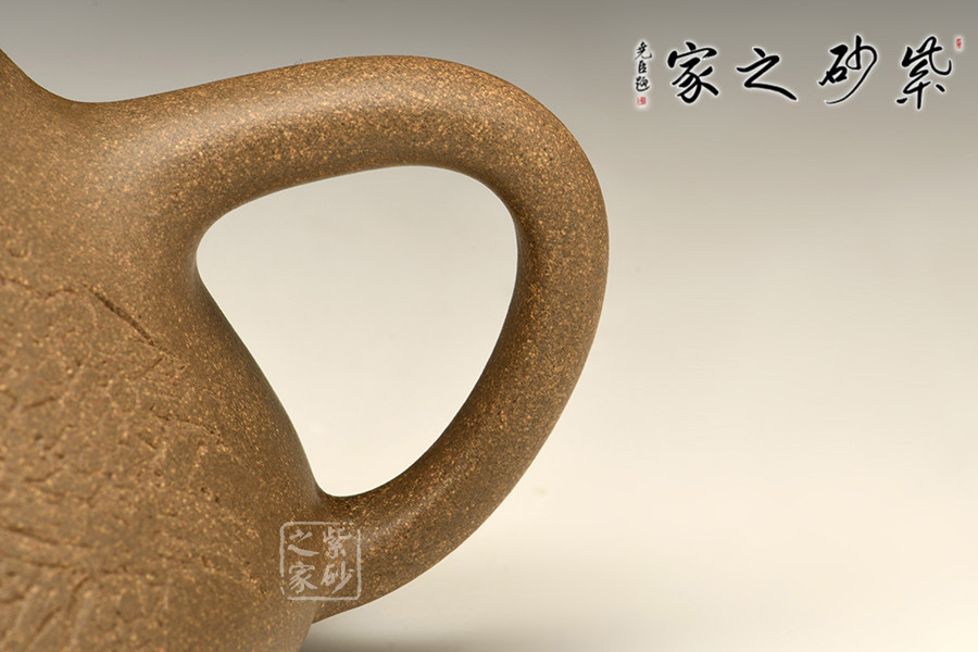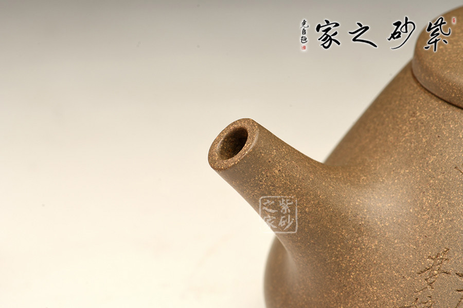 子冶石瓢的造型,大約是道光時(shí)期曼生手繪首創(chuàng)的壺式,是文人與陶藝的妙合,它蘊(yùn)涵了豐富內(nèi)涵的人文意趣。從壺式上看,壺形上小下大,重心下垂,造型沉穩(wěn),壺嘴為矮而有力的直筒形,出水暢順,極速有力。壺身呈“金字塔”式,壺流、壺口、壺把三點(diǎn)形成水平直線,符合科學(xué)性,觀賞端莊敦穆。