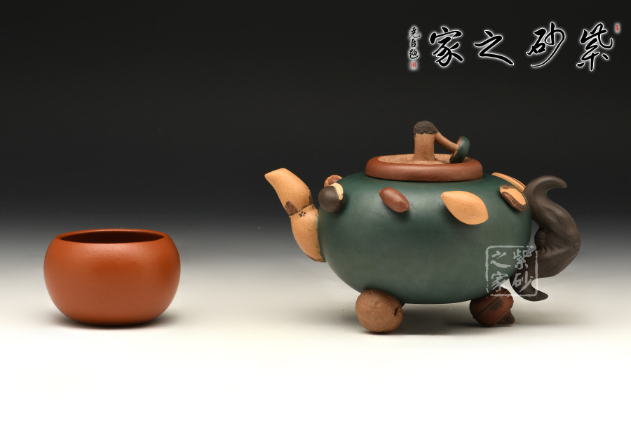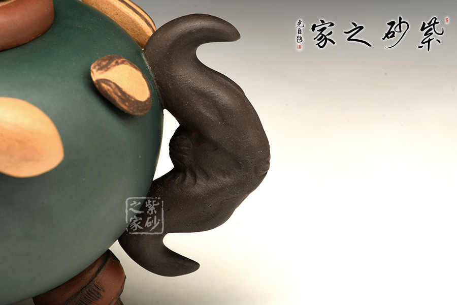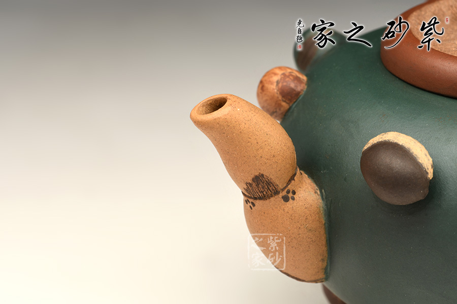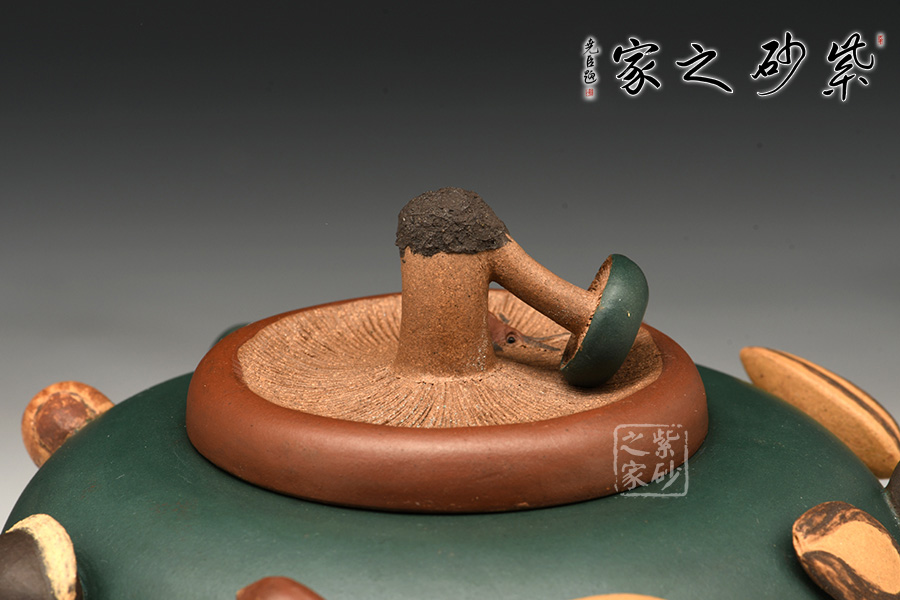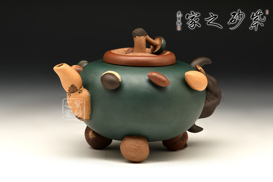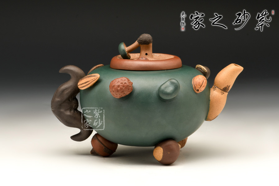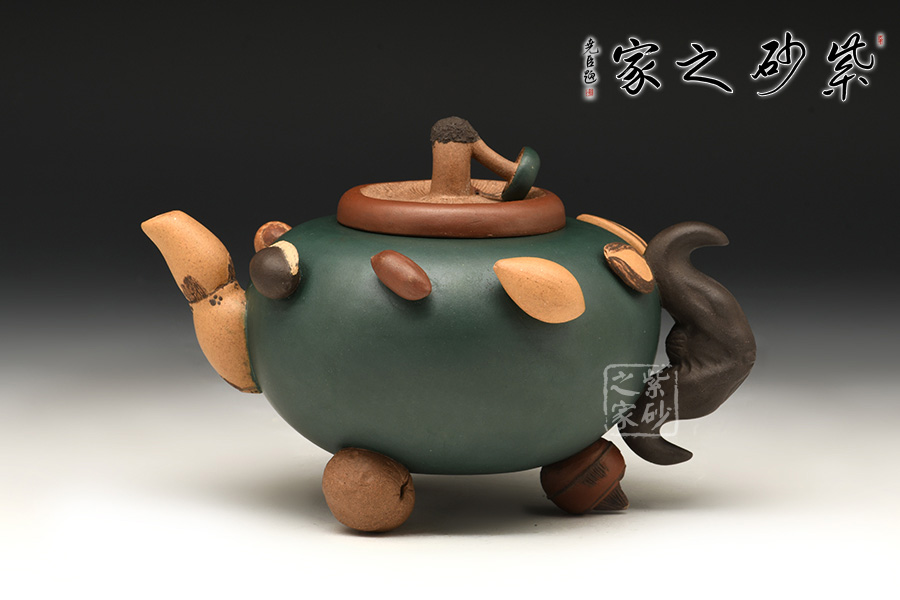 圓扁腹型壺身,一莫只老菱做把,香菇為蓋,蓮藕做流,三足各為核桃、荸薺、桂圓。壺肩裝飾著花生、蠶豆、烏豆、紅棗、蓮子、瓜子、葵瓜子、白果繞成一圈,仿真瓜果不僅形似色肖,更是靈秀非凡。在配色及泥料掌握上有高人一等的成就。