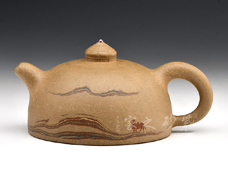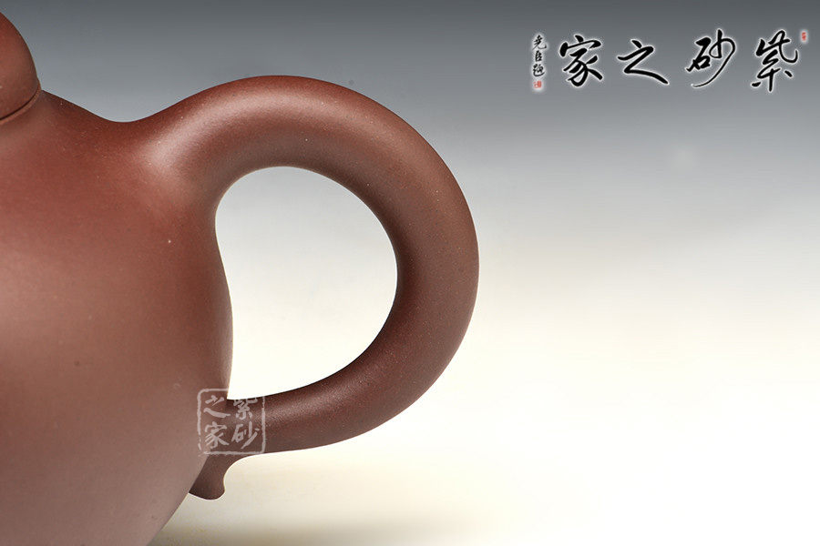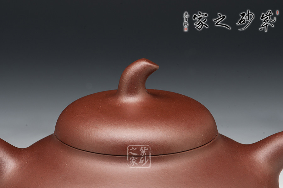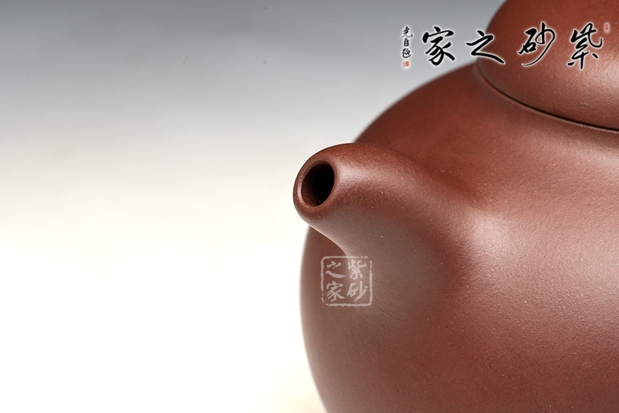 此作造型簡潔秀雅,古雅質(zhì)樸,敦厚有力。全器圓潤光滑,雄健渾厚,做工精巧細致,充分流露出珠圓玉潤的光潔美感??谏w接合緊密,渾然一體,氣勢非凡。壺嘴、壺把、壺鈕力感強烈,且與壺身構(gòu)成的整體線條流暢和諧,比例協(xié)調(diào),厚實穩(wěn)重。