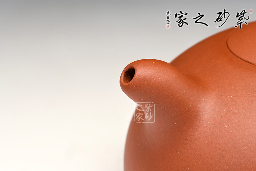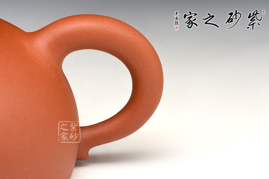 此壺器身由極精簡的線面架構(gòu)成形,流線豐滿光潤,自然服帖,身蓋相連呈截蓋,鈕為扁圓狀。流短而粗大,位置略微偏上,把與流和諧對稱,視覺上更為穩(wěn)重。其圓潤豐腴之美,將女子的優(yōu)雅飄逸展露無遺。整器渾圓天成的狀態(tài),顯示出制壺藝人的功力。