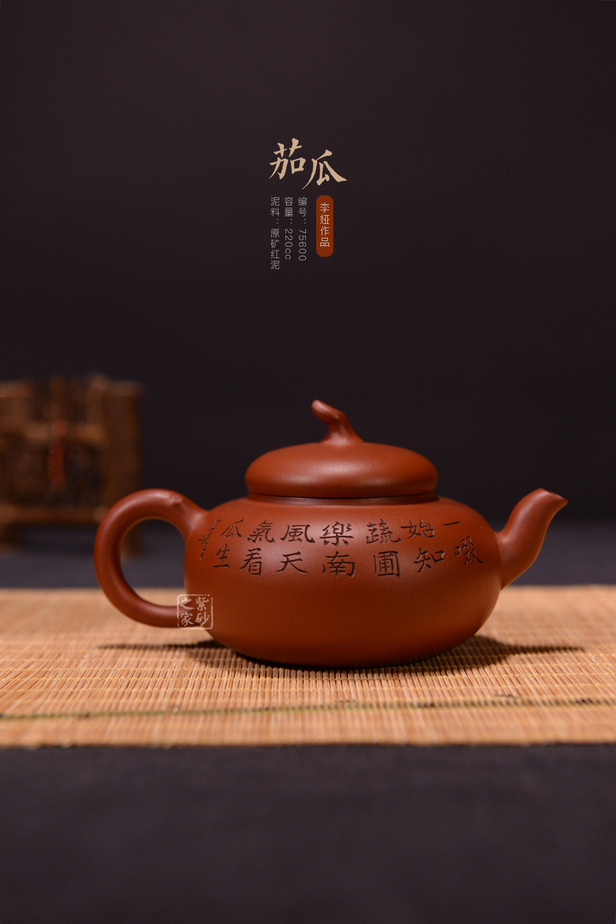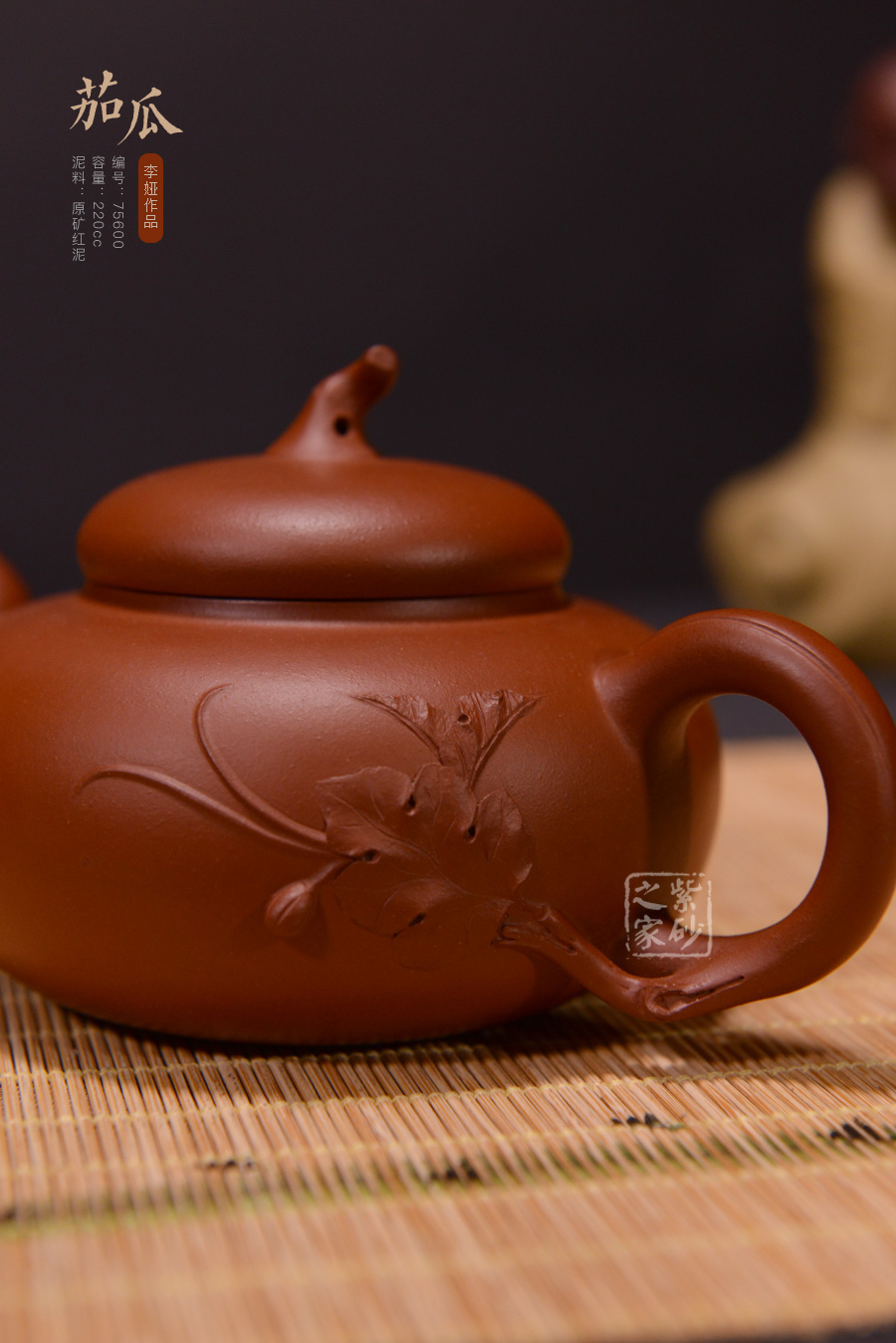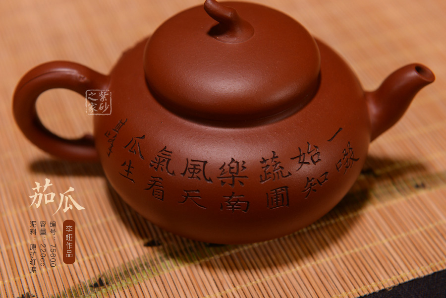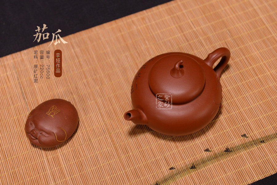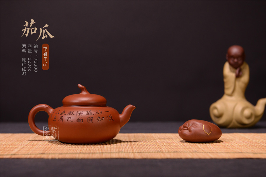 此壺泥料純正,純樸自然,壺腹扁圓,壺鈕似茄把,壺身就是一茄子,造型逼真,做工精細(xì)。整器造型古樸大方,線條流暢自然,口蓋嚴(yán)密。壺身貼塑新瓜嫩葉裝飾,是一件大巧若拙的佳作。