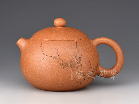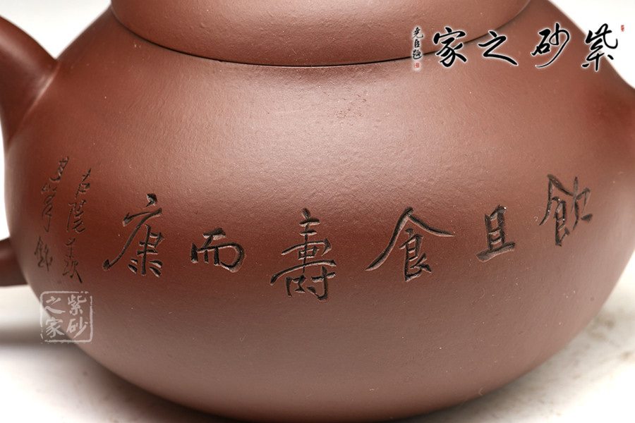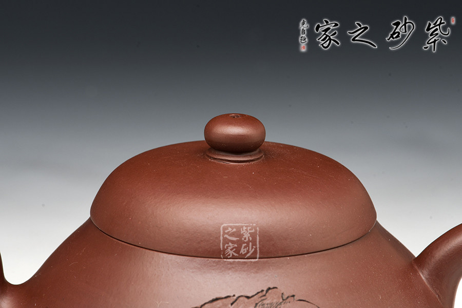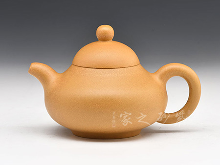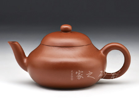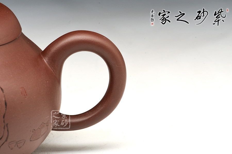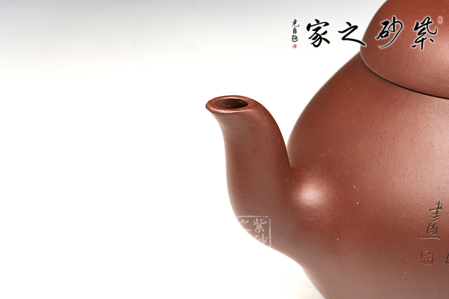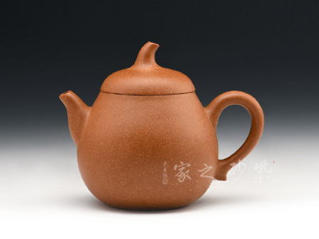 此壺作梨形,造型秀美,精巧可愛,砂色純正,胎質(zhì)緊致。環(huán)把纖纖,彎流俊挺,腹部圓鼓,截蓋拱起與器身相契合,完全融為一體,天然雕飾之視角,展現(xiàn)了匠者高超的技藝。整體觀之,頭小底大,似一鴨梨,腹部下垂但飽滿,內(nèi)如盛滿了豐厚甘甜的汁水,讓人有欲嘗先快之感。