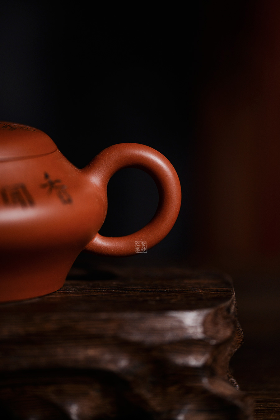 此壺型制別致少見,壺身中間闊上下斂,平蓋壓口,壺鈕短柱與壺腹一致。彎流嘴修長而出,耳形把形態(tài)優(yōu)美,與壺嘴相應和。整款壺把握精準到位,線面分明,做工精良。