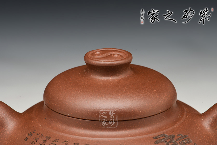 此壺砂色沉穆,包漿內(nèi)蘊。整體形制為經(jīng)典線圓的壺式,壓蓋鼓起,柱形鈕,鈕面刻太極陰陽雙魚,猶添新趣。