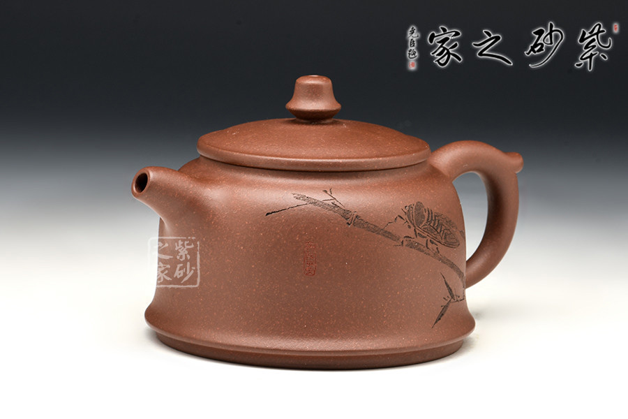 金鐘壺,以其形似古鐘而得名,由傳統(tǒng)經(jīng)典造型演變而來,是紫砂壺傳統(tǒng)經(jīng)典造型之一。其型曲中有直,剛中帶柔,勻稱協(xié)調(diào),頗顯作者功力。器型仿效古代鐘形,壺體、壺嘴、壺把、蓋鈕皆比例構(gòu)造和諧,實(shí)用功能保證,且具藝術(shù)美感。