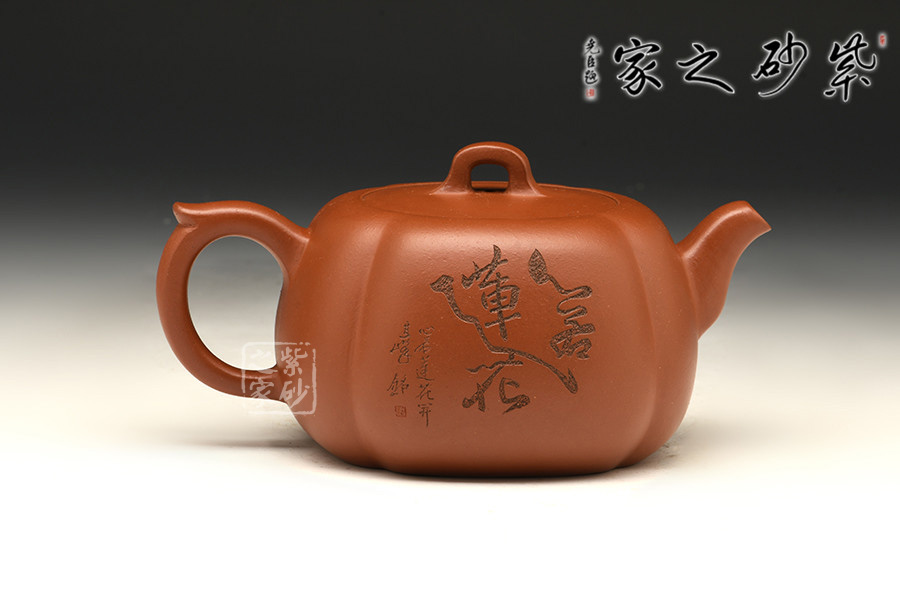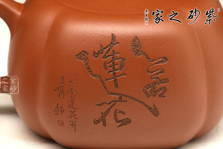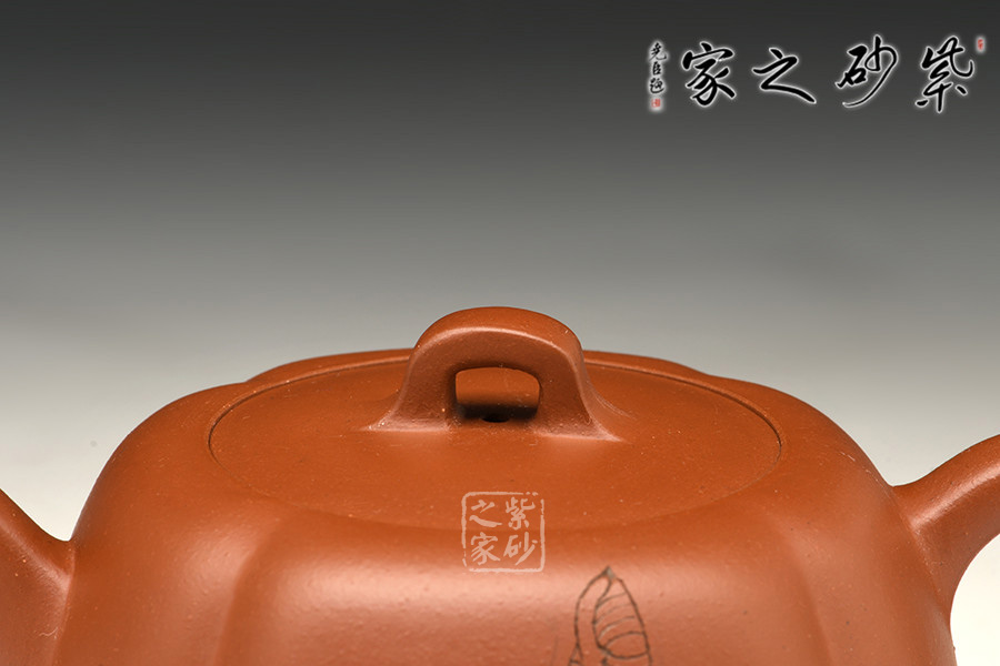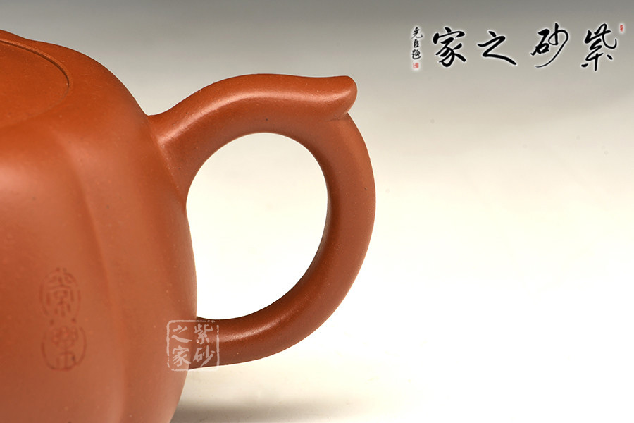 這款壺紅泥材質(zhì),砂質(zhì)細密,色澤清雅。壺身呈扁圓柱體,其間有規(guī)則凹線,整體似呈蓮花瓣形。嵌蓋緊密,與壺身渾然一體,蓋面之上橋型鈕,剛中卻有柔勁。