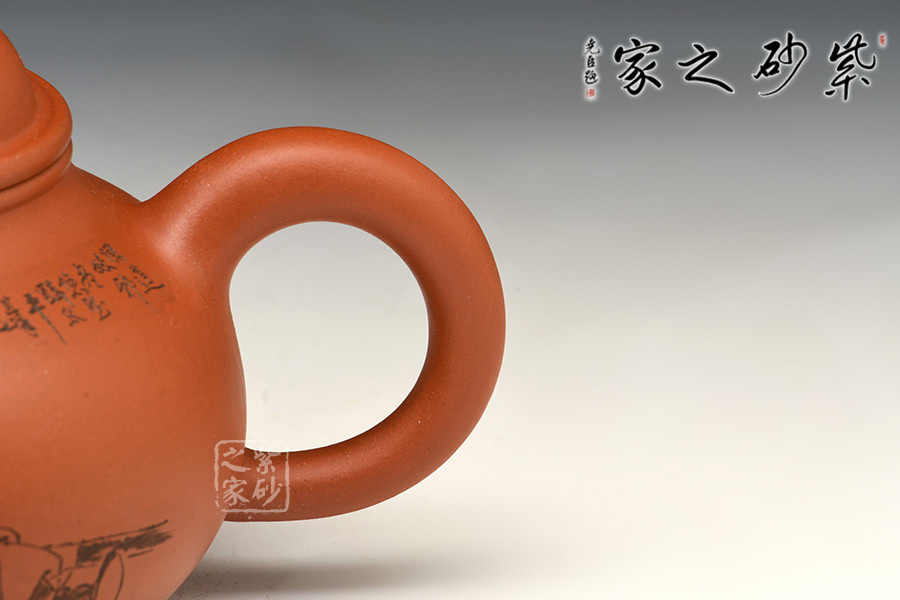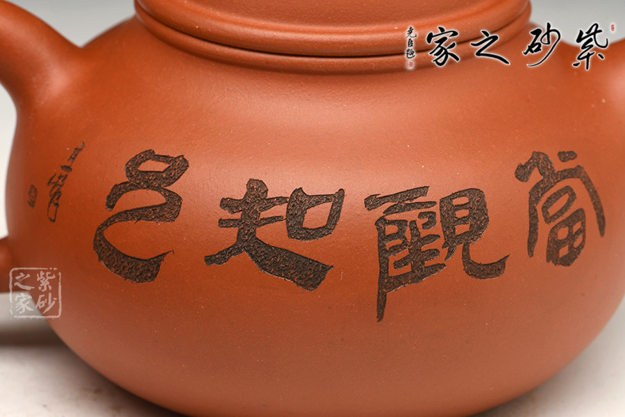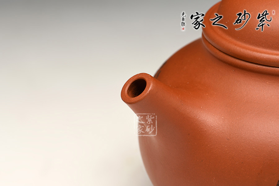 壺身圓潤飽滿,視覺上穩(wěn)重大度,在質(zhì)樸中見深厚,流短而上翹,力度十足,把弧度圓潤輕靈,在氣韻飽滿的壺身上添加一微微矮頸,壺蓋增高成半球狀,平添拙樸童趣。