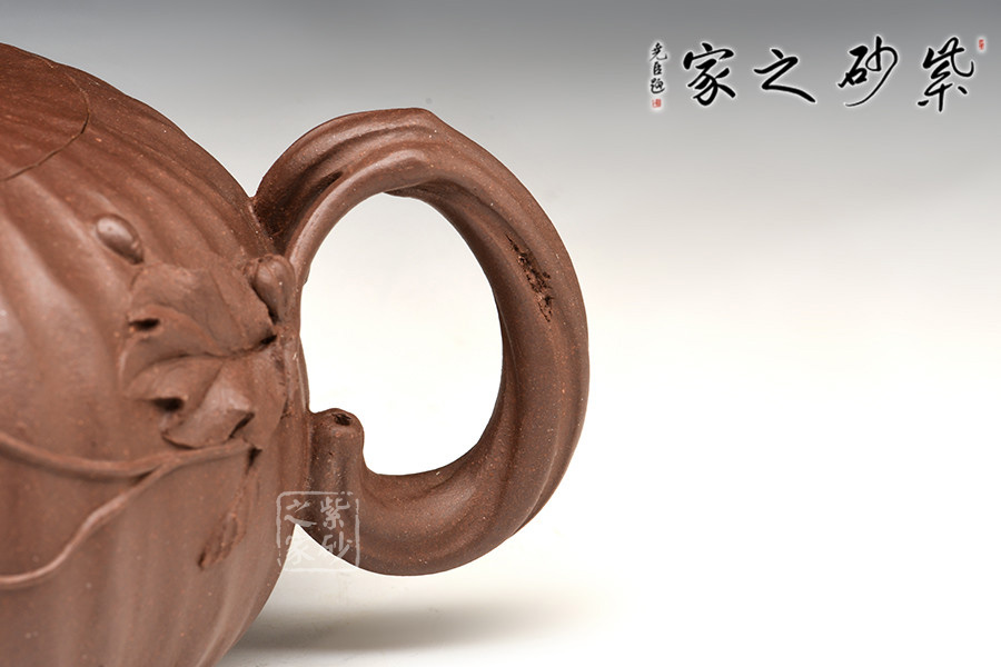 南瓜形壺,具有自然生動敦實的輪廓,瓜瓤豐滿,生機盎然。瓜蒂為蓋鈕,瓜葉卷成壺嘴,瓜藤圈成壺把,氣勢得體,舒展自若。壺身瓜葉藤蔓別具生氣,纏攀自然,布局合理,生活氣息濃郁,體現出美麗的田園情趣。