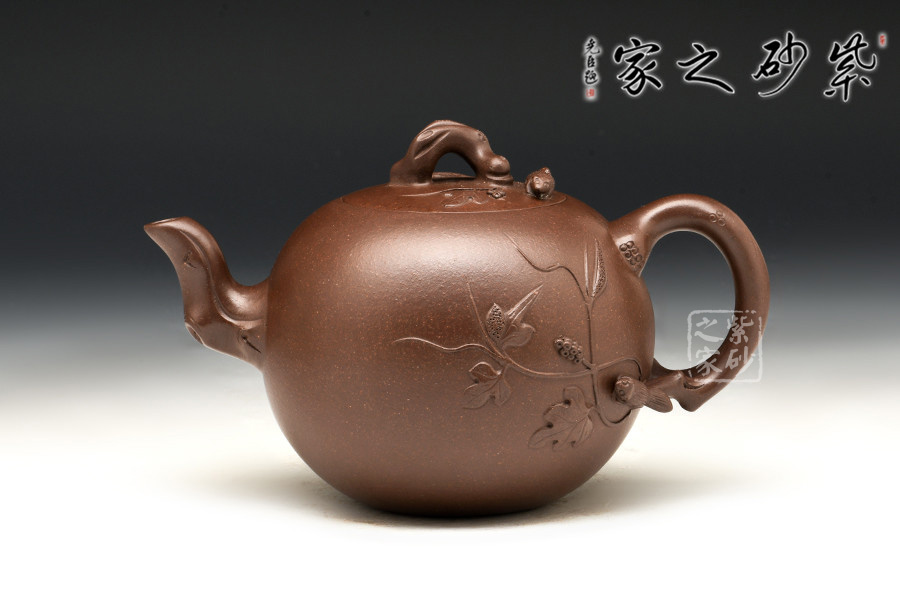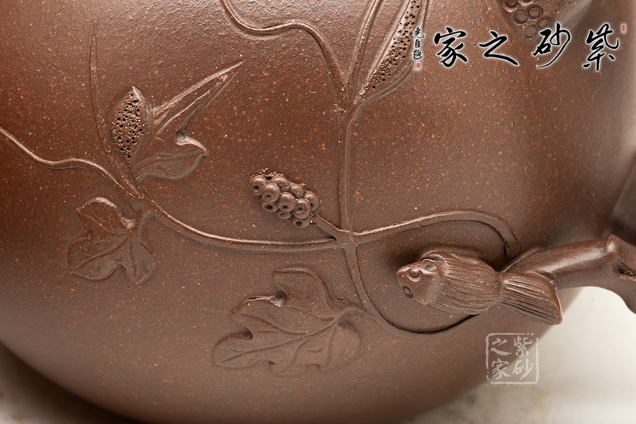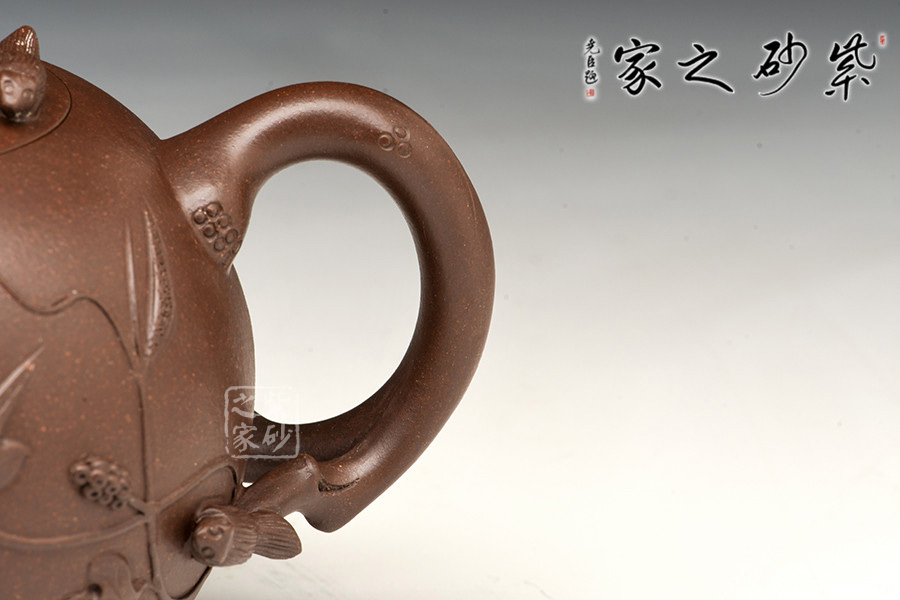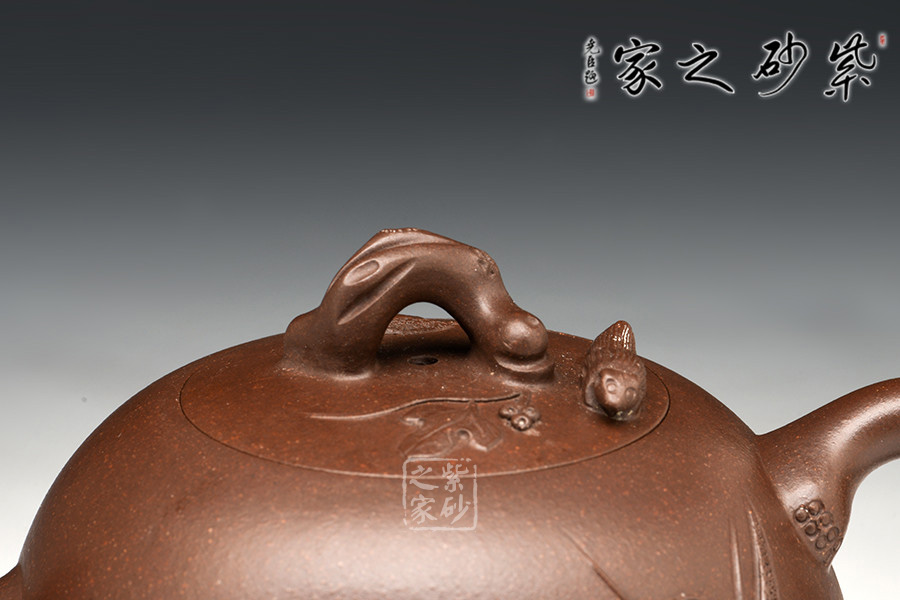 松鼠葡萄的題材在紫砂壺創(chuàng)作中并不少見,因其趣味性和藝術性共存的特征,歷來便深受人們的喜愛且雅俗共賞。古人將葡萄與松鼠結合在一起的藝術表現(xiàn),含有多子多福的美好祝愿。作品展示
