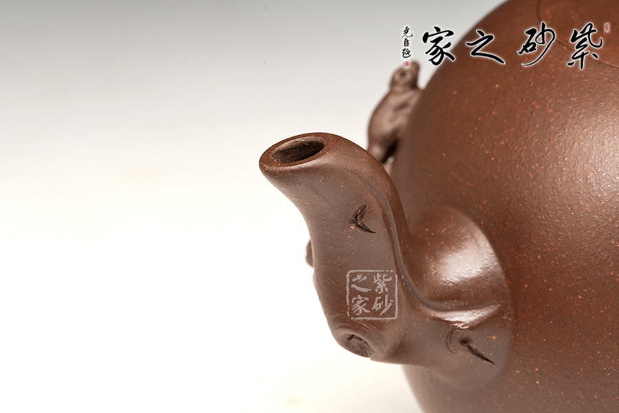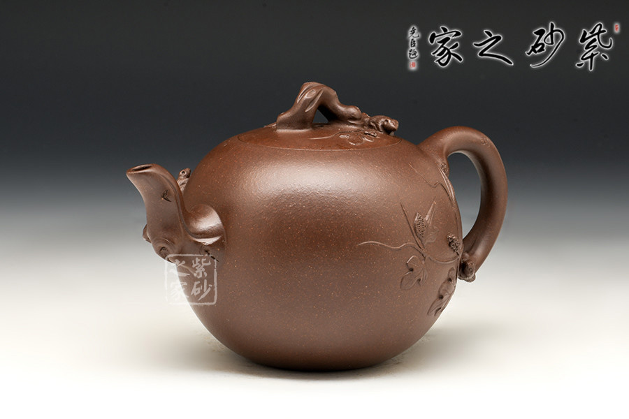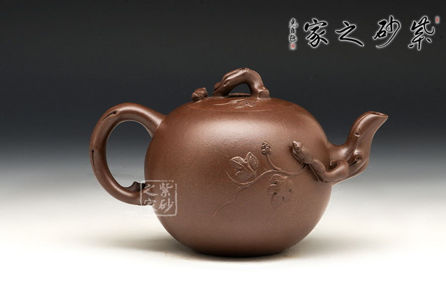 作品造型奇特,將自然界的動植物融入到紫砂藝術當中,更加貼近生活情趣。整器為飽滿的圓器,嵌蓋設計與壺身渾然一體,壺嘴、把、鈕為虬曲的葡萄藤,形態(tài)優(yōu)美,觀之讓人感覺大自然的生動氣息。