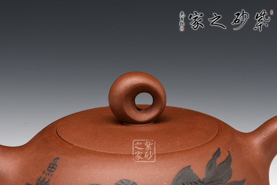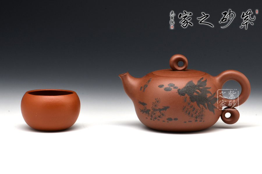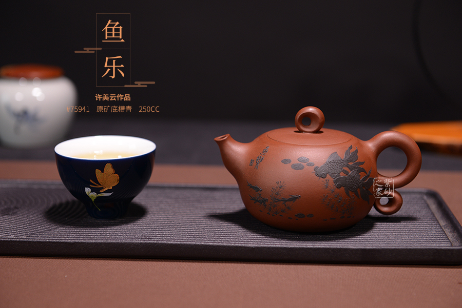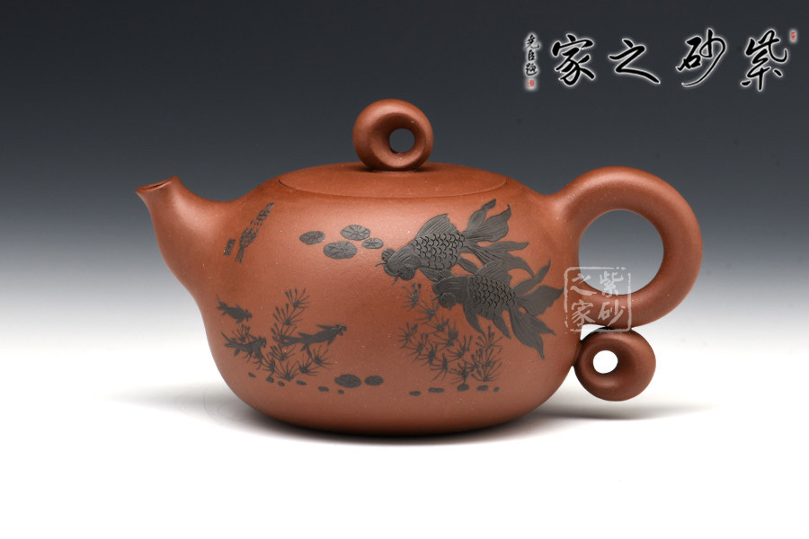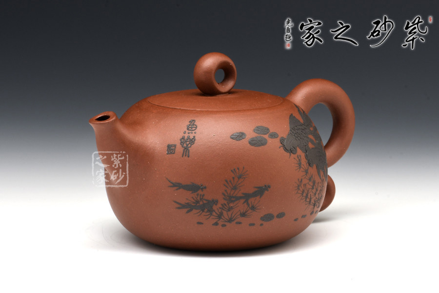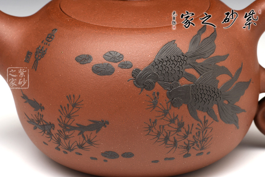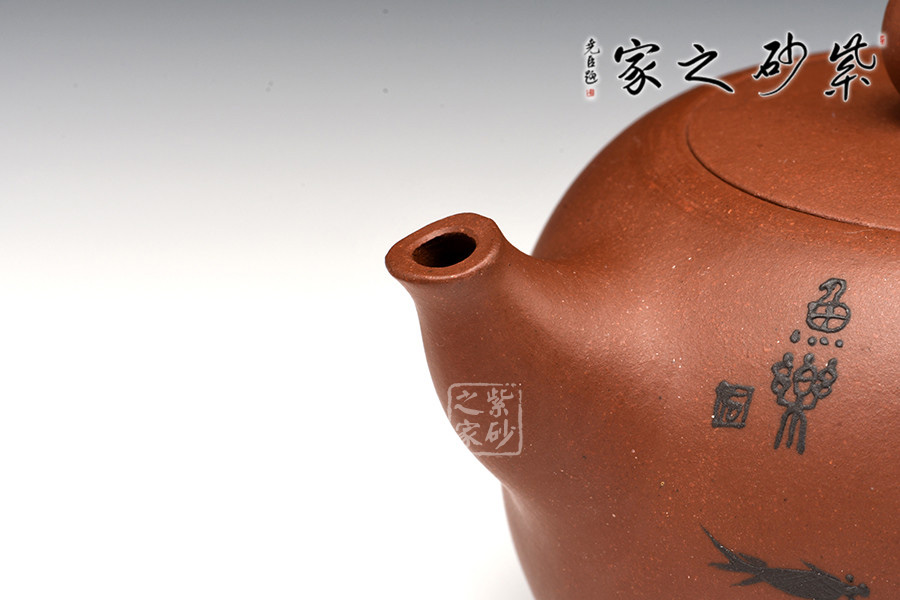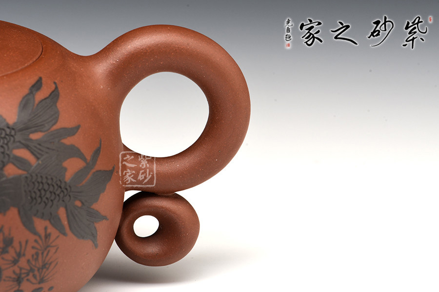 暗接的壺嘴粗細(xì)變化細(xì)致有度,像一只魚(yú)嘴一樣,一張一翕。壺身之上裝飾游魚(yú)暢玩,活靈活現(xiàn),更增添自然情趣。