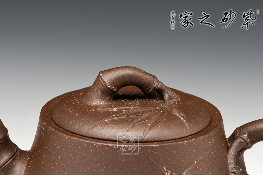 此壺不規(guī)則壺身,選泥精細,取材于竹節(jié),壺嘴塑成三段竹節(jié)曲流,把、鈕亦仿竹枝彎曲成形,與壺流相呼應(yīng)。壺蓋、壺身之上貼飾片片枝葉,轉(zhuǎn)曲自然,靈動逼真,極富雅趣。