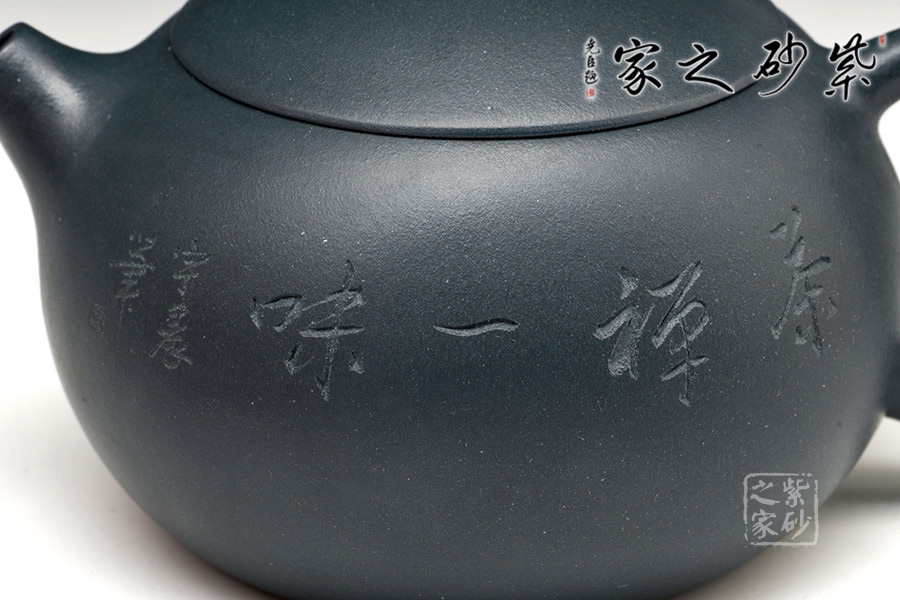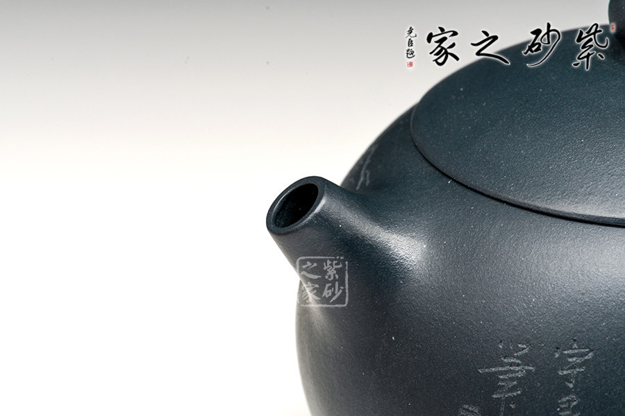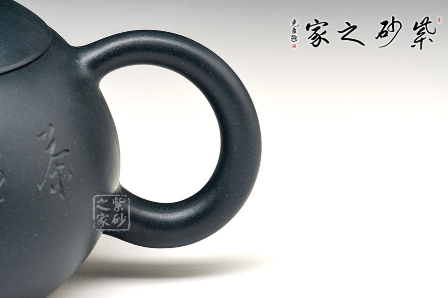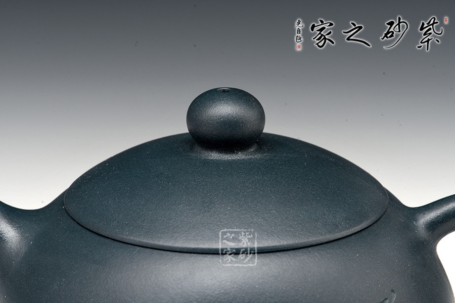 此壺器身由極精簡的線面架構(gòu)成形,流線豐滿光潤,自然服帖,身蓋相連呈截蓋,鈕為扁圓狀,底向里收斂。流短而粗大,位置略微偏上,把圈向下傾斜,俗稱“倒把”,壺流與把和諧對稱,視覺上更為穩(wěn)重。