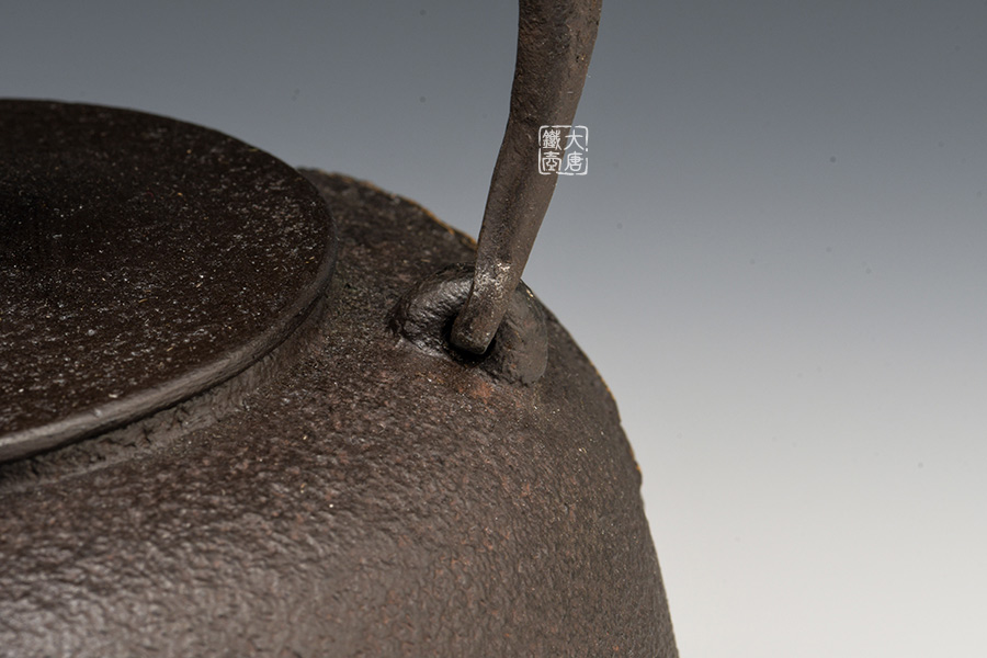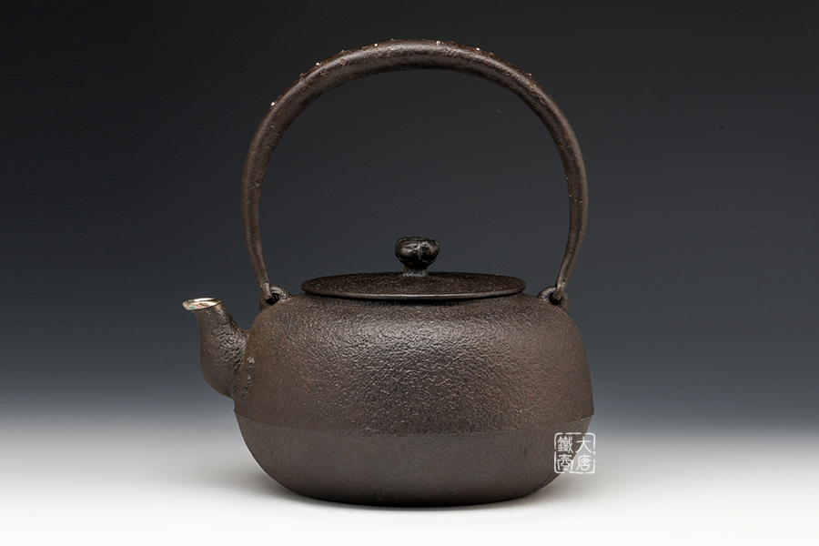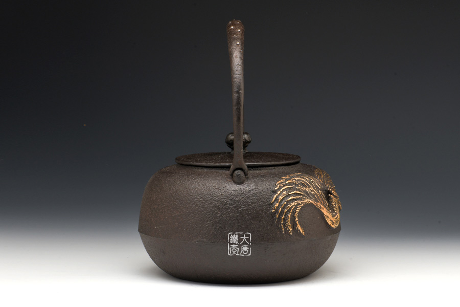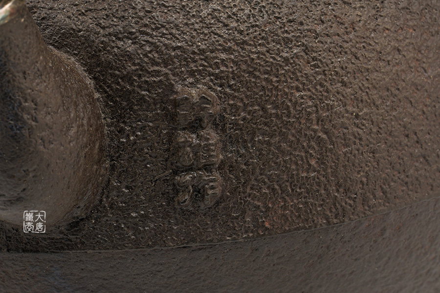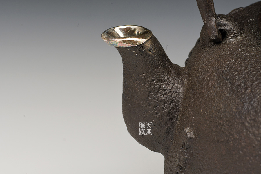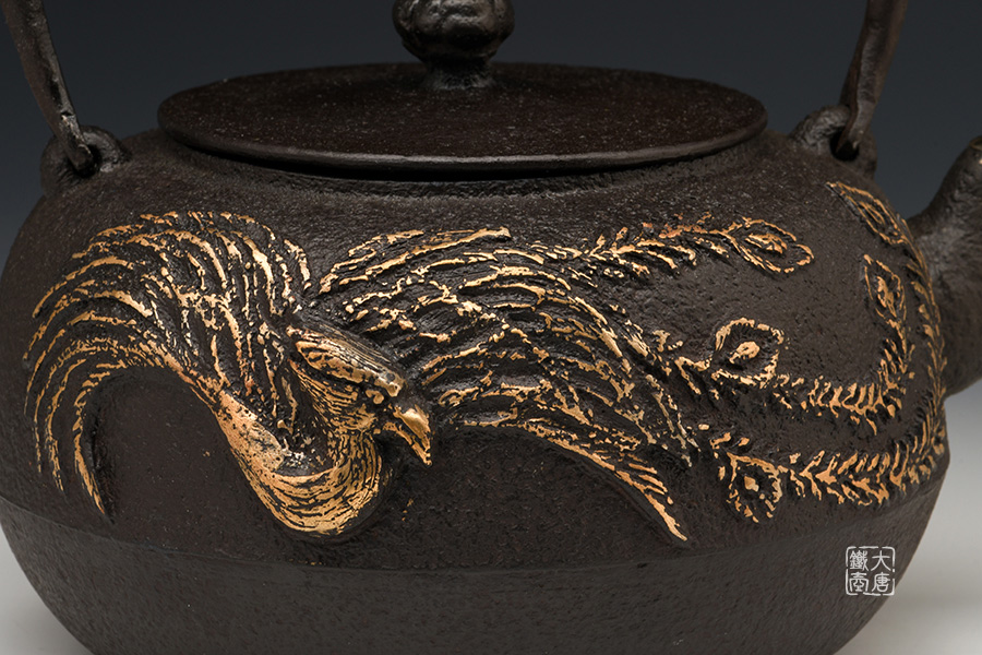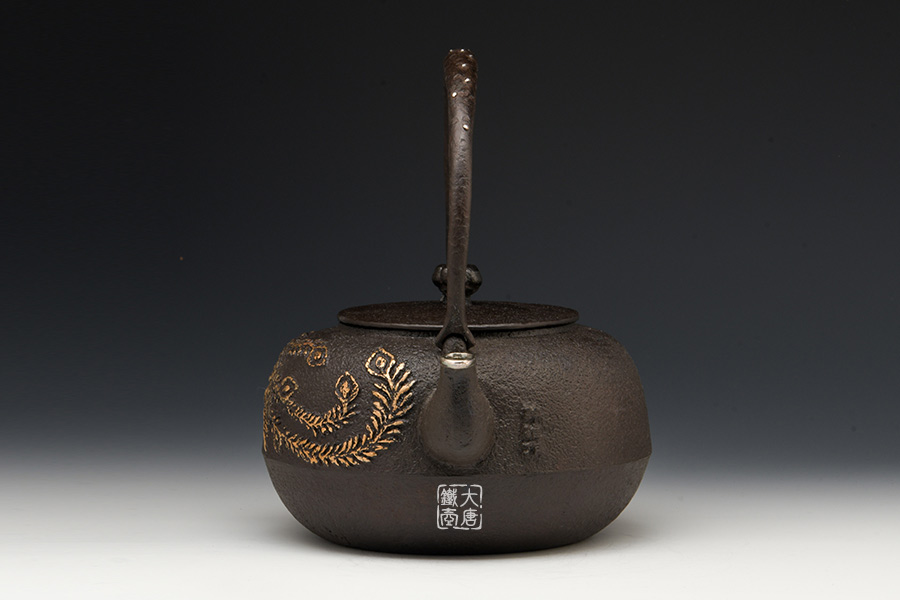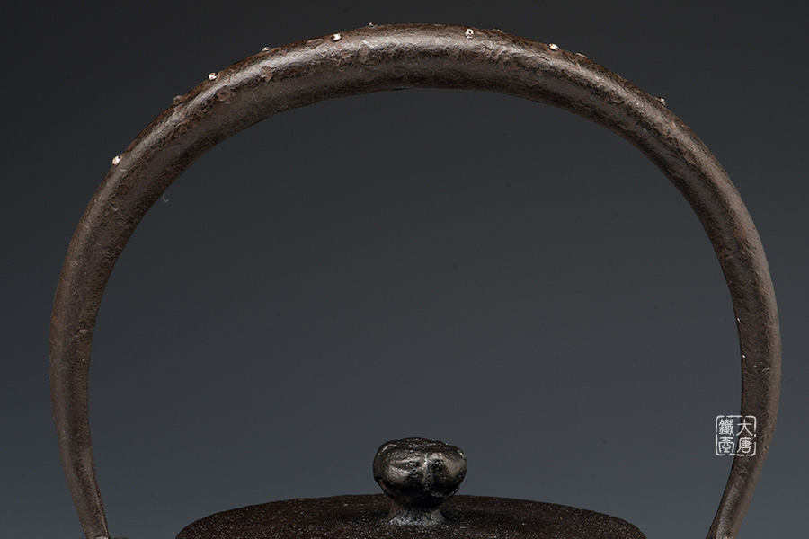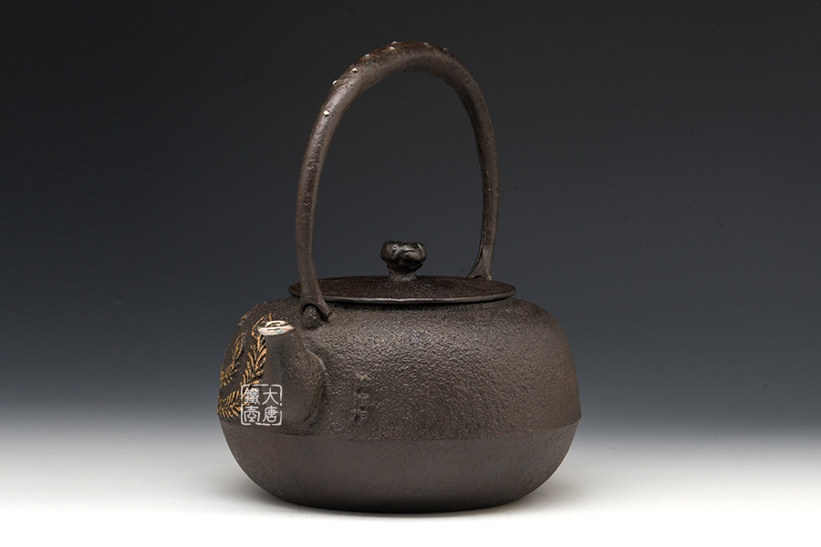 荒井工房的鐵瓶除了在鑄造工藝上有嚴格的規(guī)范和體系,在鐵瓶裝飾技術上也頗有建樹。除了傳統(tǒng)的印刻技術外,荒井工房還掌握了非常出色的金銀鑲嵌技藝,尤其以大片的鏨刻銀片最為出眾,這在山形當?shù)靥每谥歇殬湟粠谩?/p>