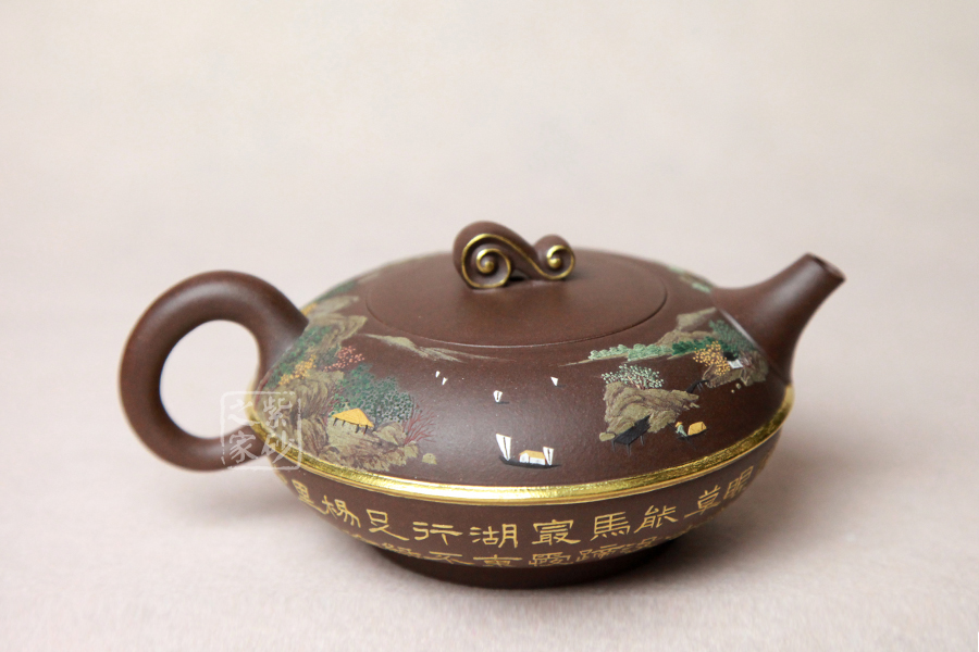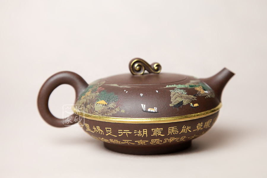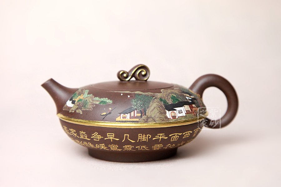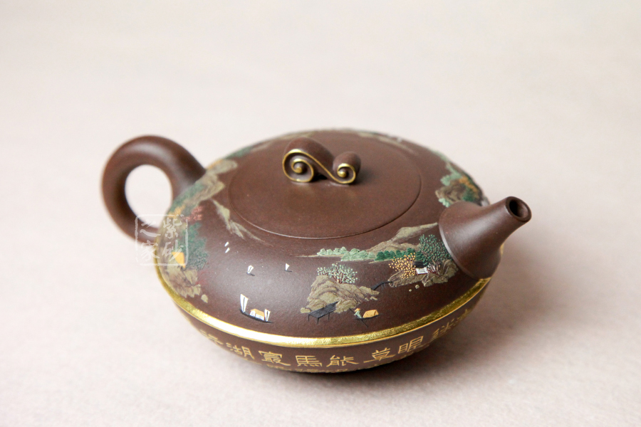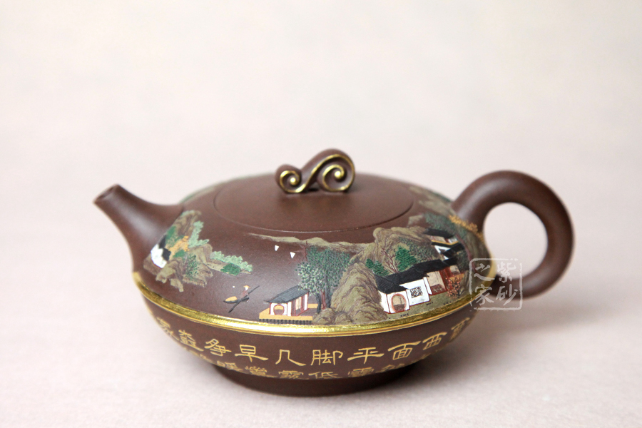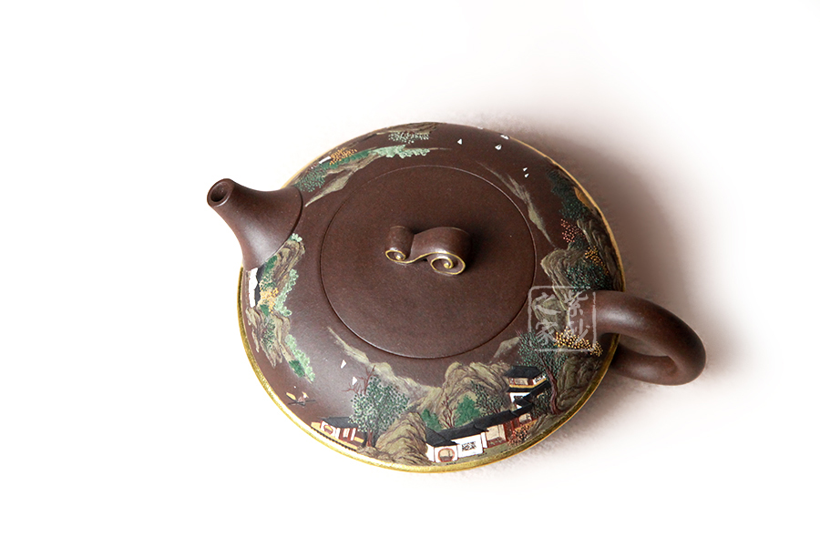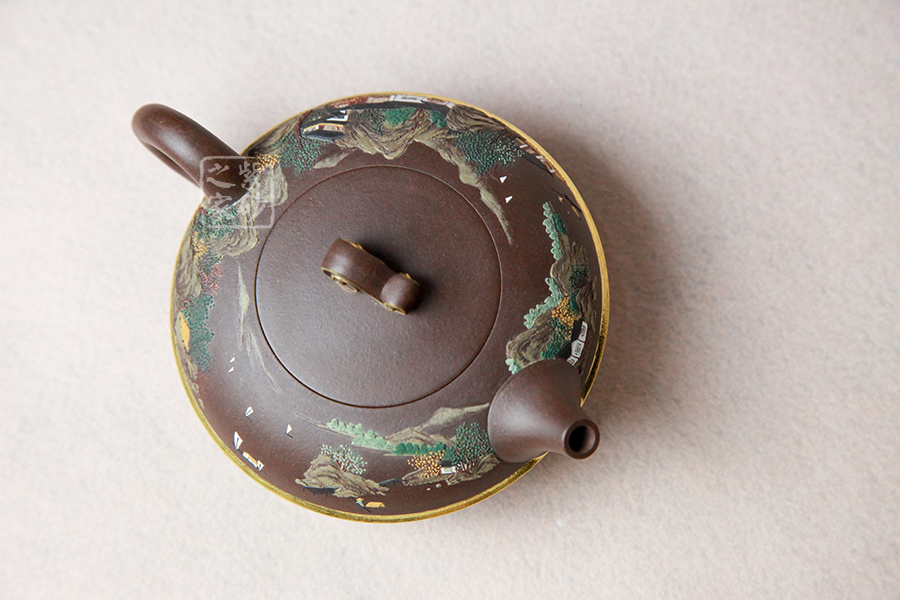 這款金如意腰線壺,融合了傳統(tǒng)古典元素。泥繪山水,作者技藝高超,設(shè)色典雅,營造出水墨濃淡暈染的效果。如意造型壺鈕,代表中國傳統(tǒng)的吉祥圖案,寓意美好。