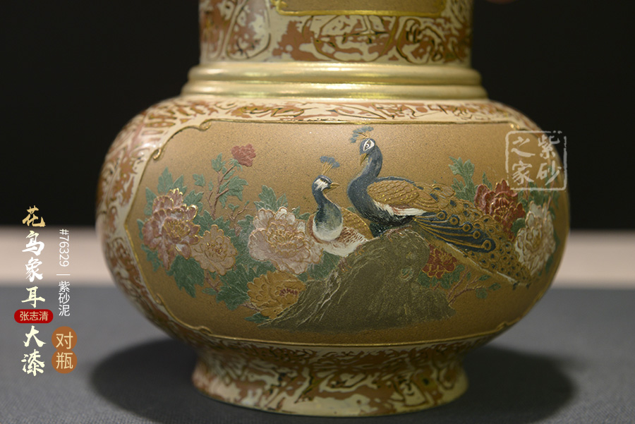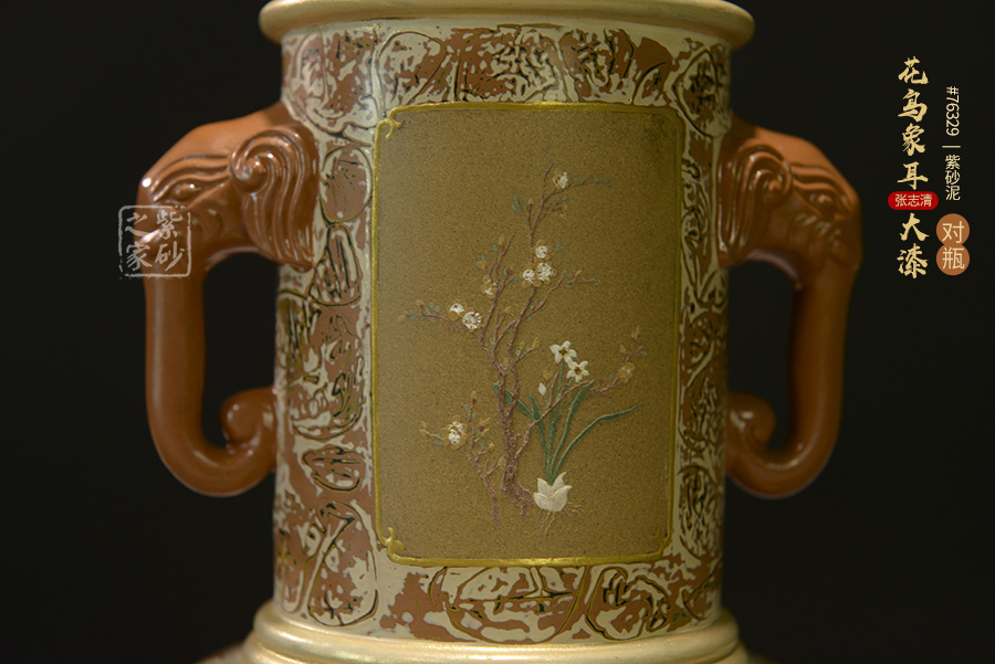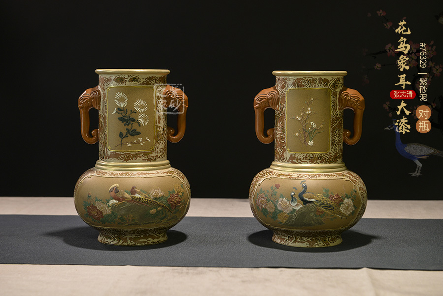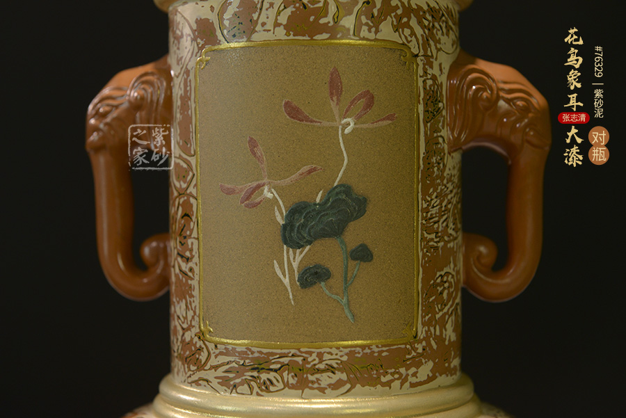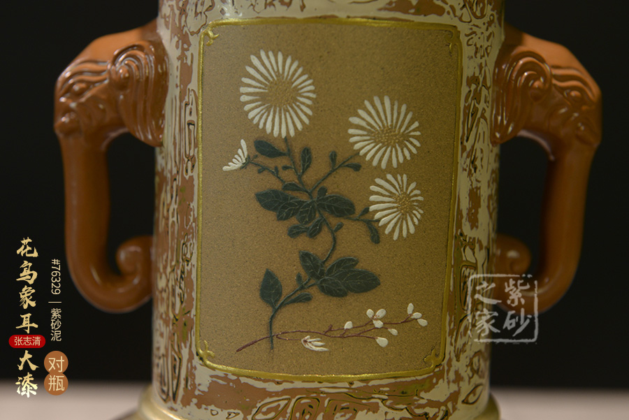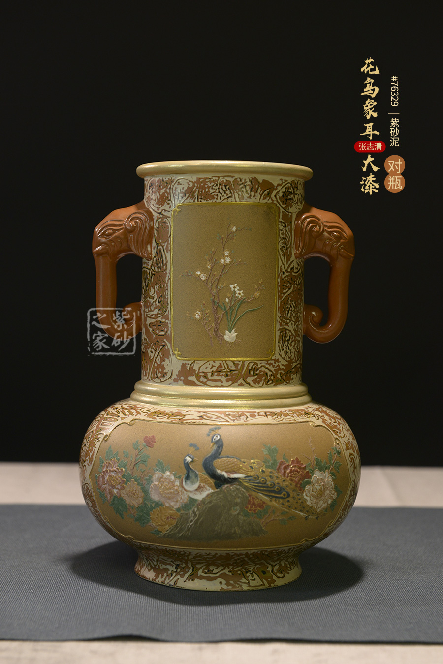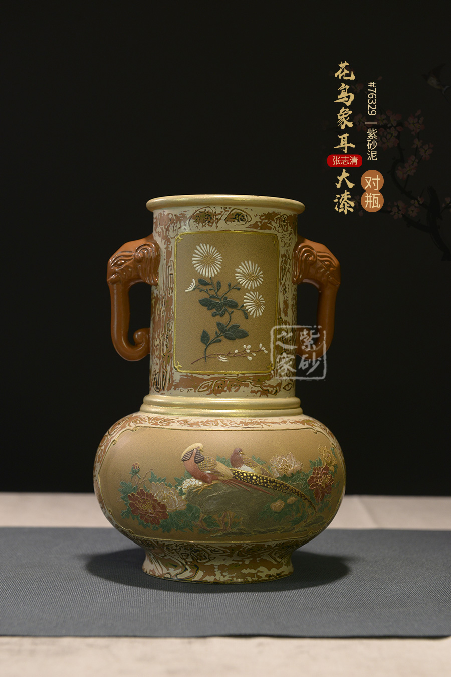此對(duì)泥繪花鳥瓶為張志清的代表作,其器型仿青銅器制,鼓腹,豎頸,大口,圈足外撇,肩上兩邊對(duì)稱鋪象耳銜環(huán)。