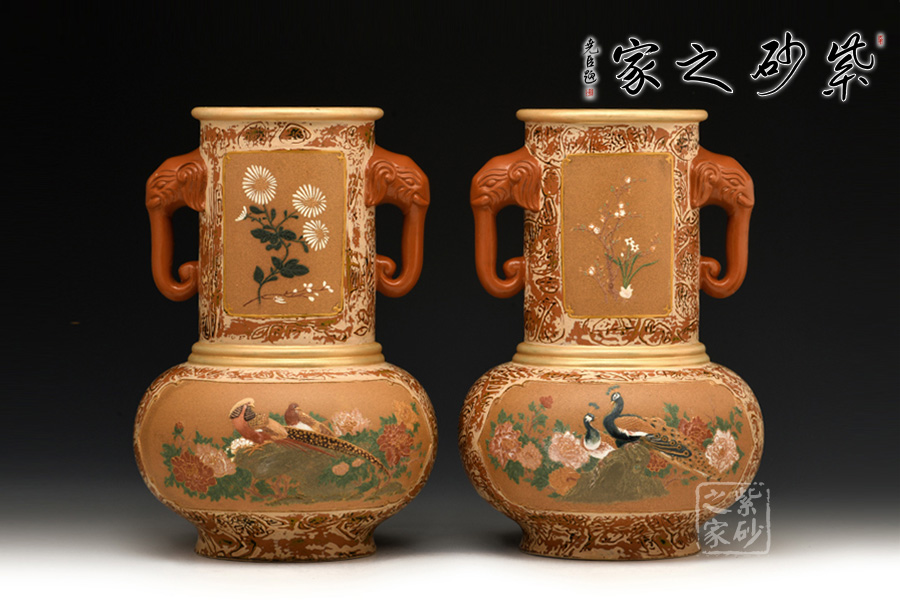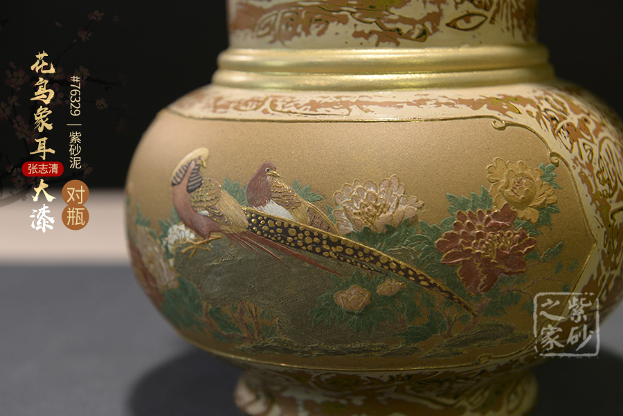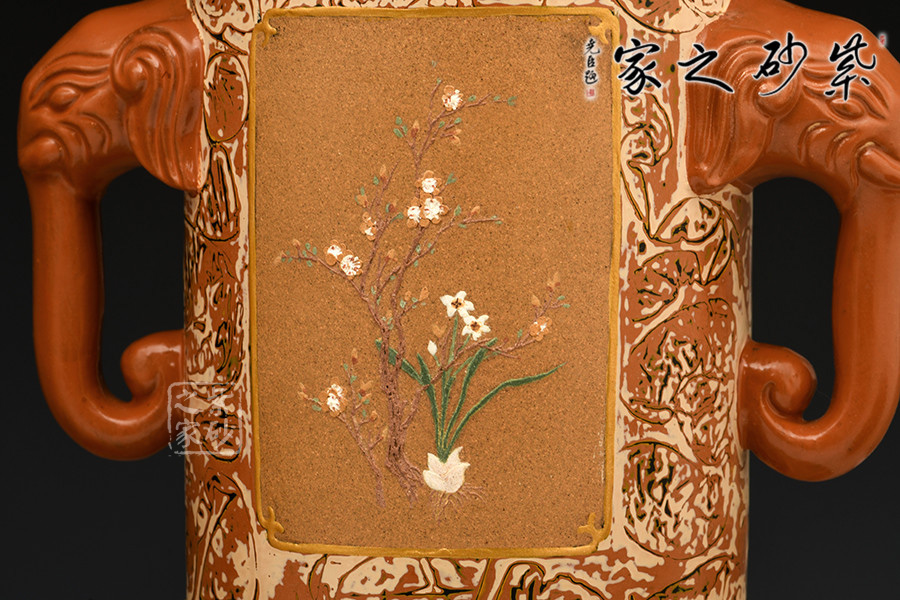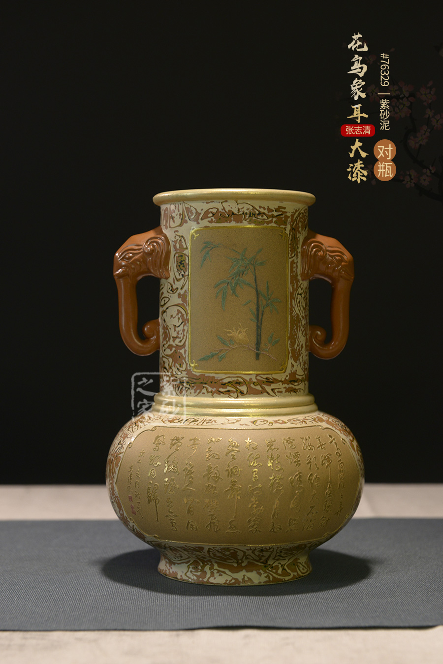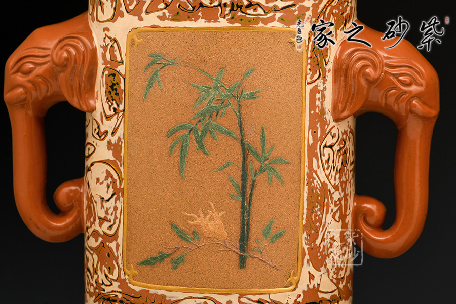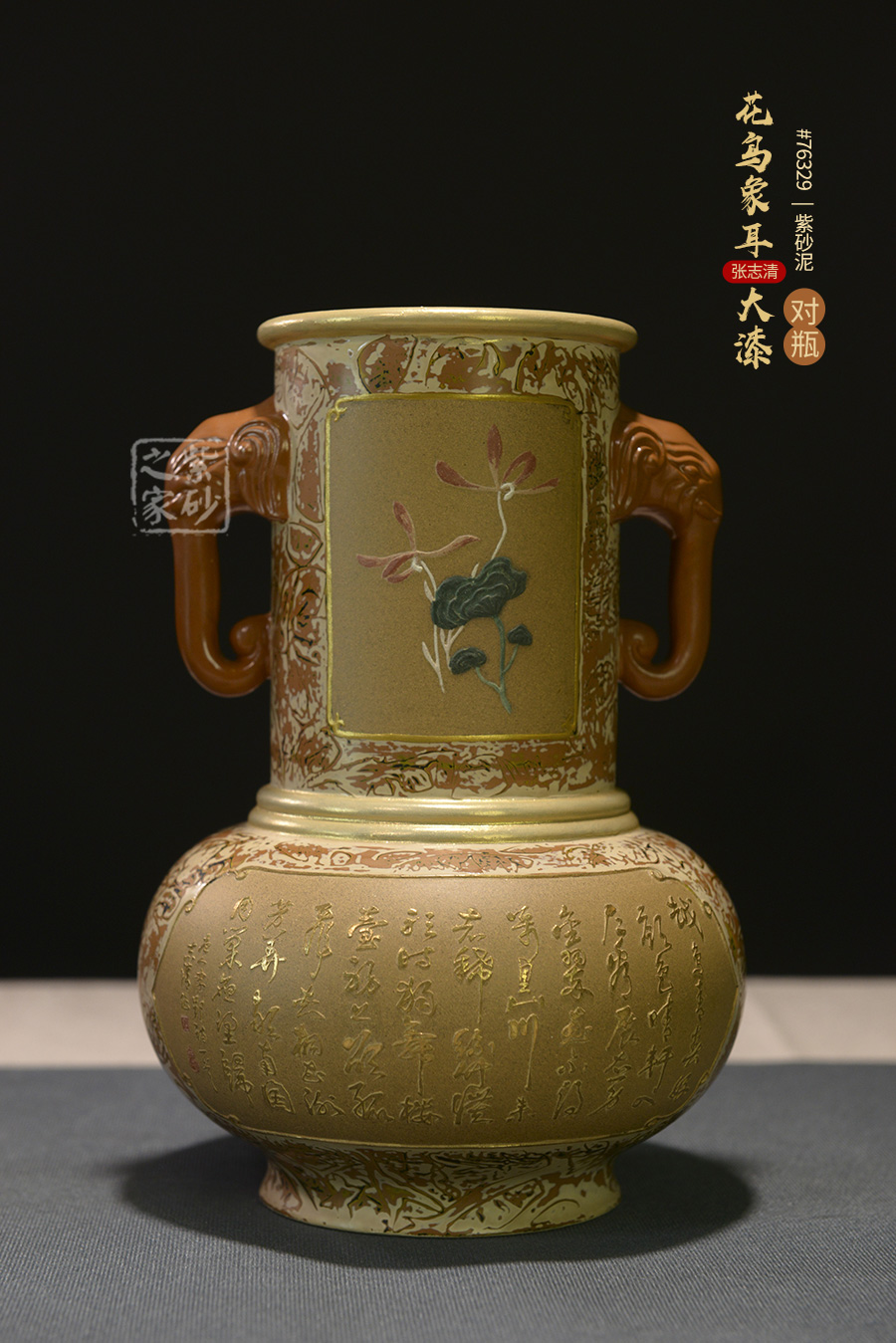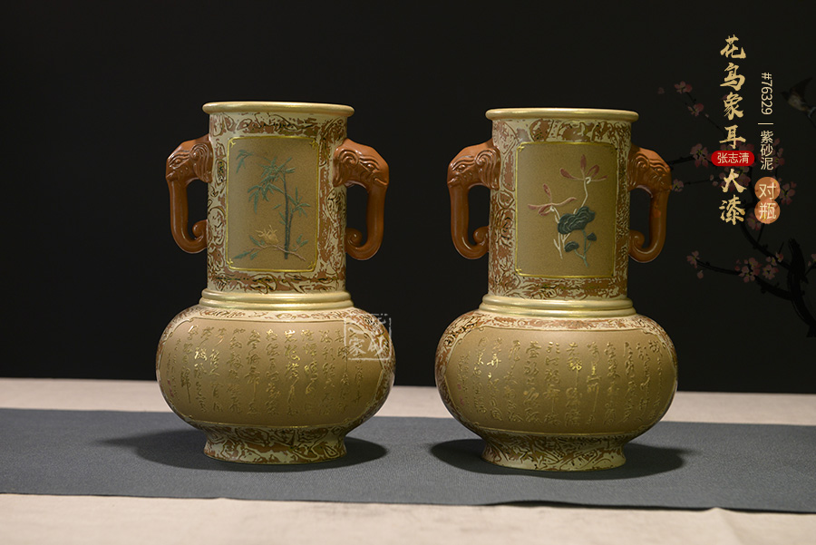 此對(duì)泥繪花鳥瓶為張志清的代表作,其器型仿青銅器制,鼓腹,豎頸,大口,圈足外撇,肩上兩邊對(duì)稱鋪象耳銜環(huán)。