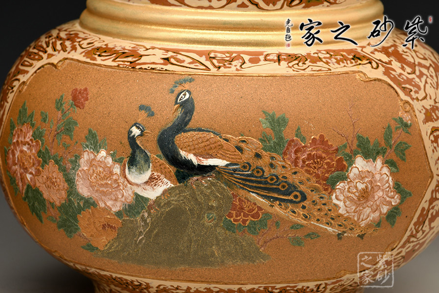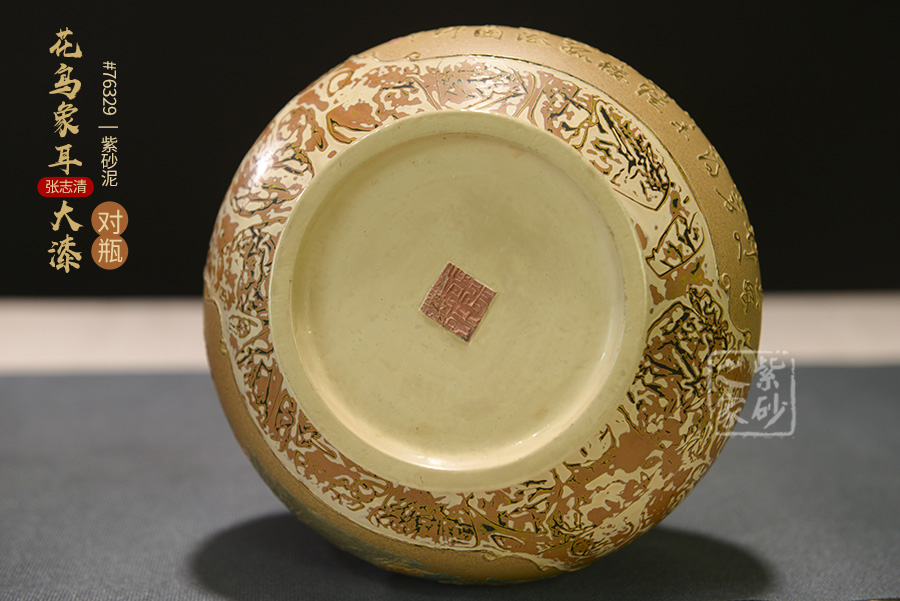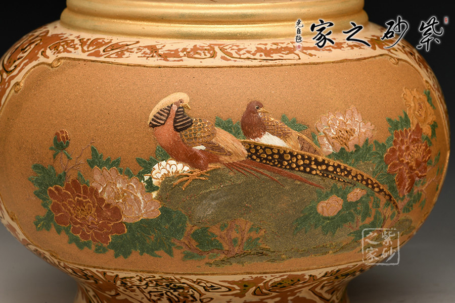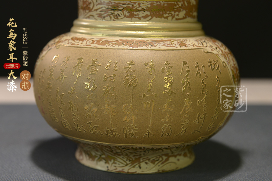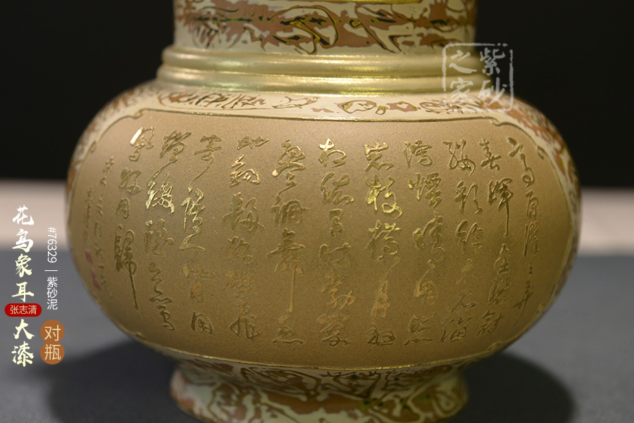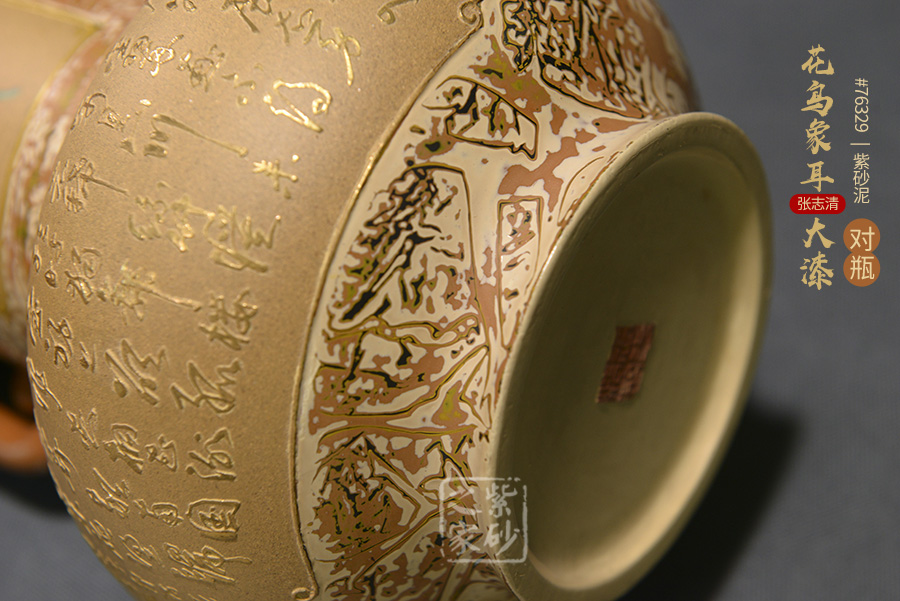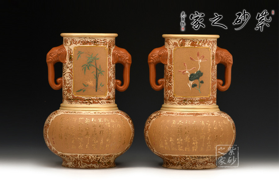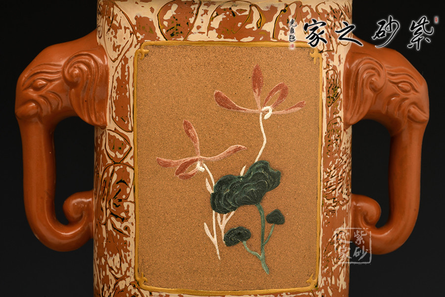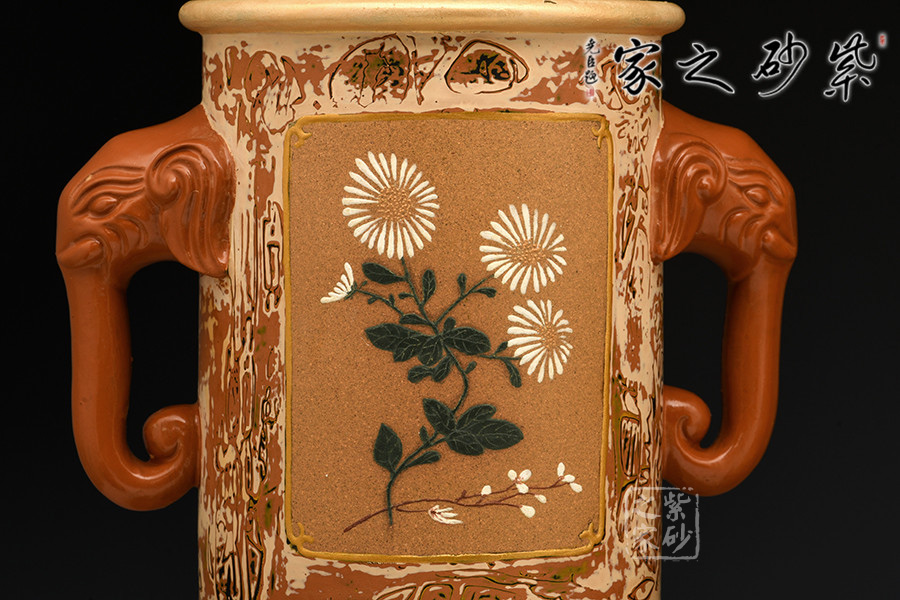 此對(duì)泥繪花鳥瓶為張志清的代表作,其器型仿青銅器制,鼓腹,豎頸,大口,圈足外撇,肩上兩邊對(duì)稱鋪象耳銜環(huán)。