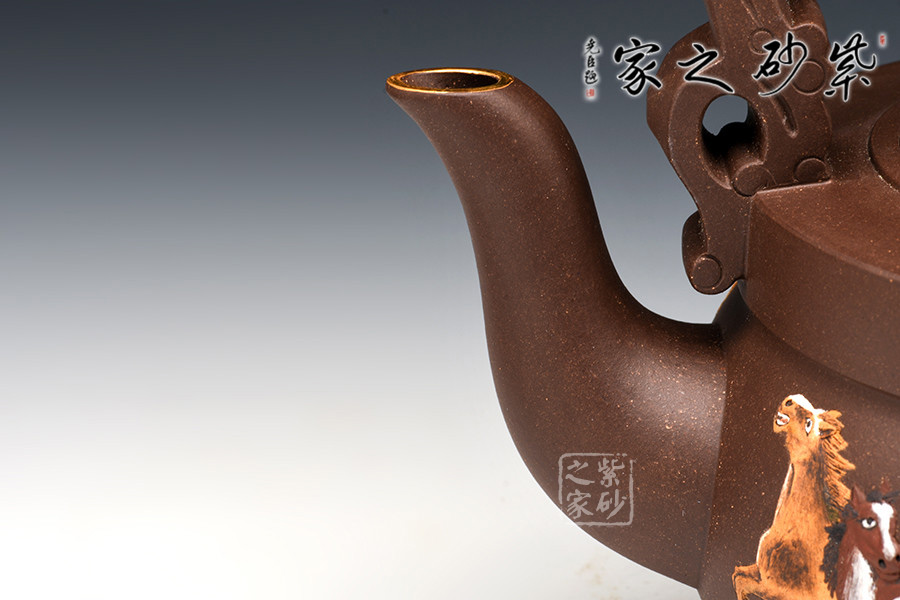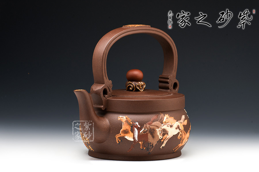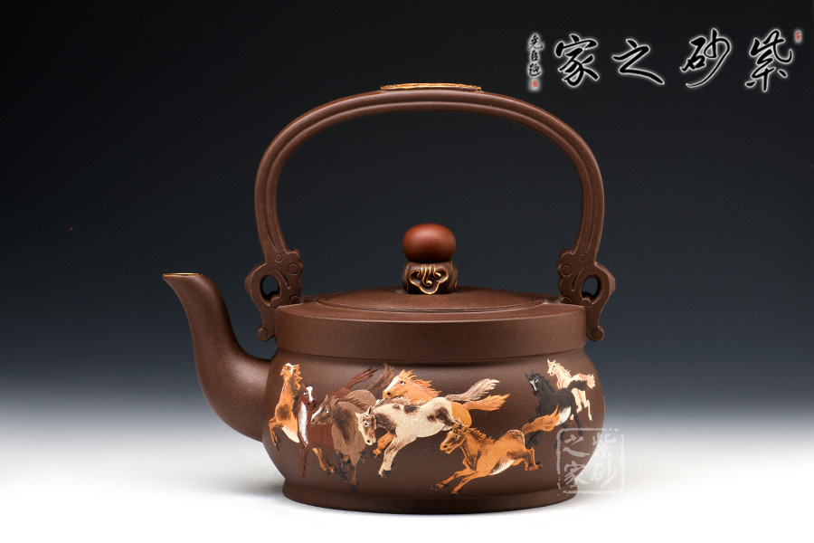 此壺構(gòu)造設(shè)計獨特,提梁把寶珠鈕,細節(jié)處鑲金裝飾,富于貴氣。加上壺身八駿圖泥繪,剛勁矯健,色彩鮮明,自然和諧,可見作者作畫與泥繪功底之深,非一日可成,極耗心神與時間,成品難得。泥繪八匹駿馬,給人以奮發(fā)圖強的象征,寓意招財轉(zhuǎn)運,貴人相助,氣數(shù)健旺。