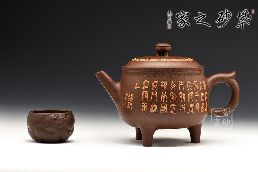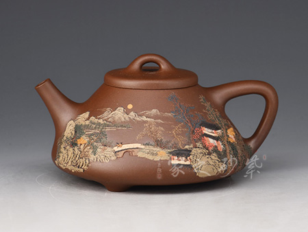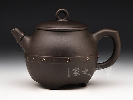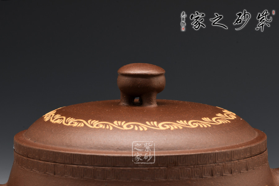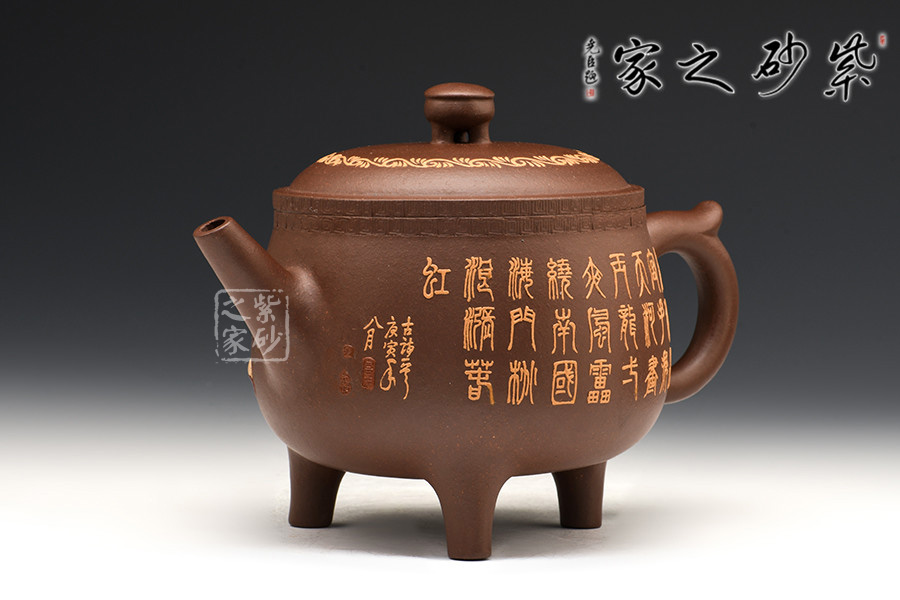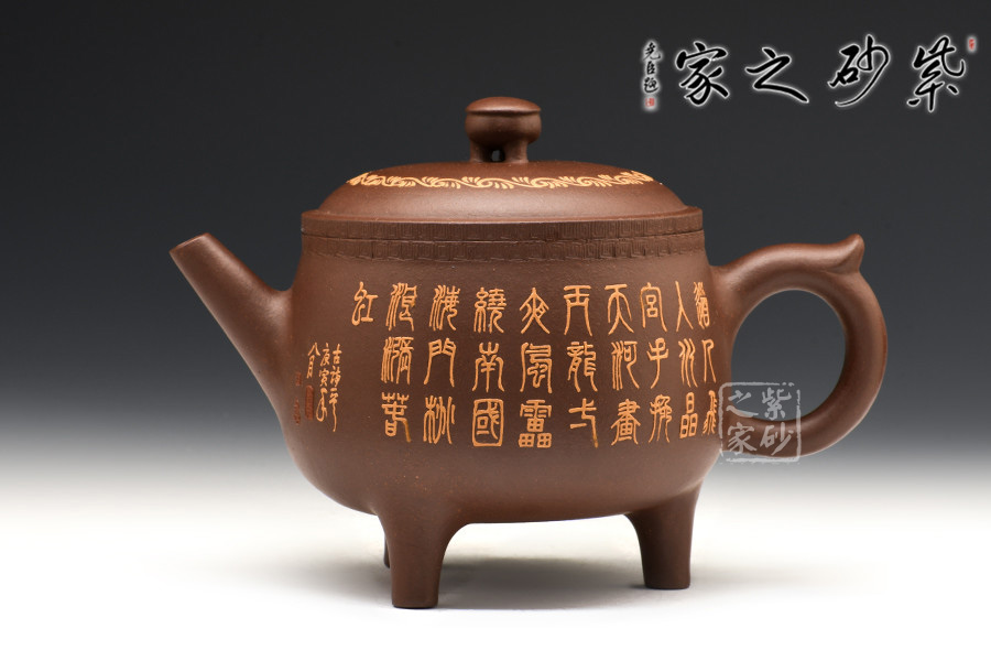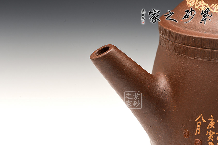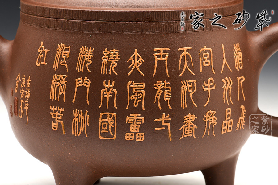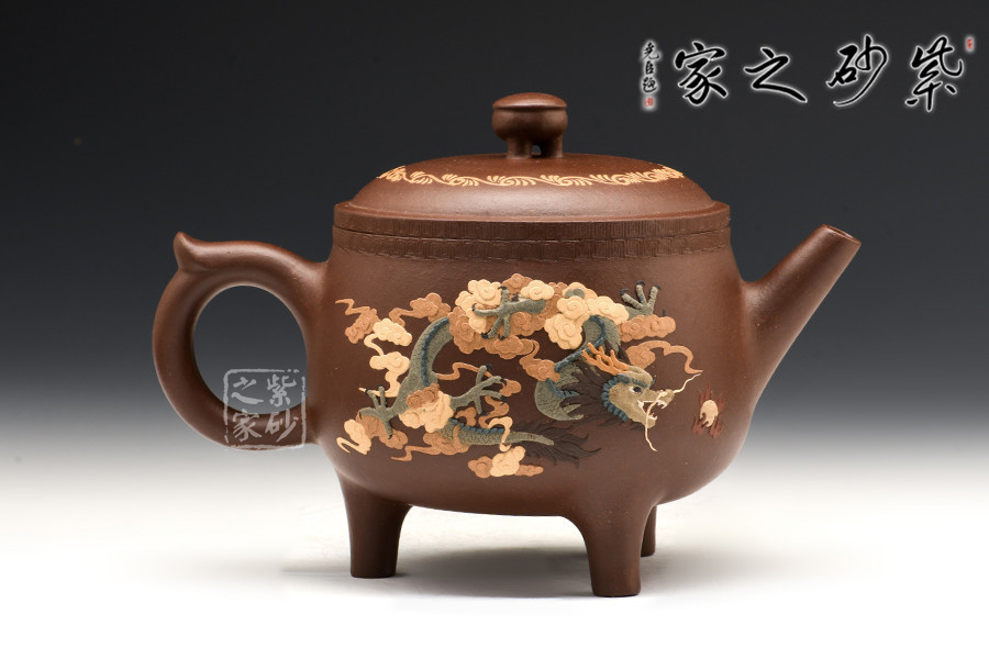 腹部呈扁圓形,兩側(cè)設(shè)直流、飛形壺把,下置三修長(zhǎng)的蹄足。蓋頂正中繪龍紋,蓋沿處刻一周繁密的紋路,加之作者通身的書畫泥繪和飛龍裝飾,一種靜謐卻又華麗之感。