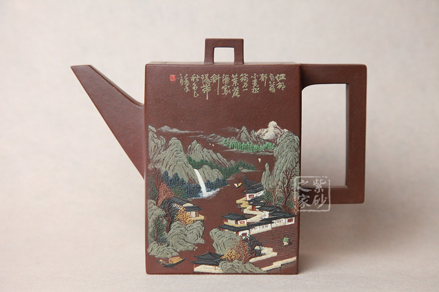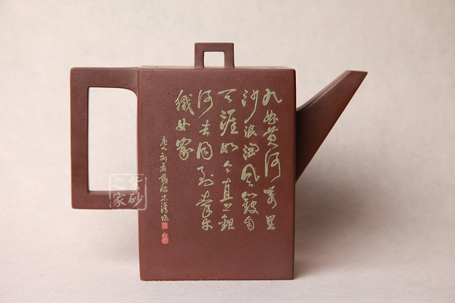 此壺器形似磚,主體、附件均由直線組成,為傳統(tǒng)優(yōu)秀壺式。制作顯其功力,線面干凈利索,直挺不板,給人以坦坦蕩蕩之式。