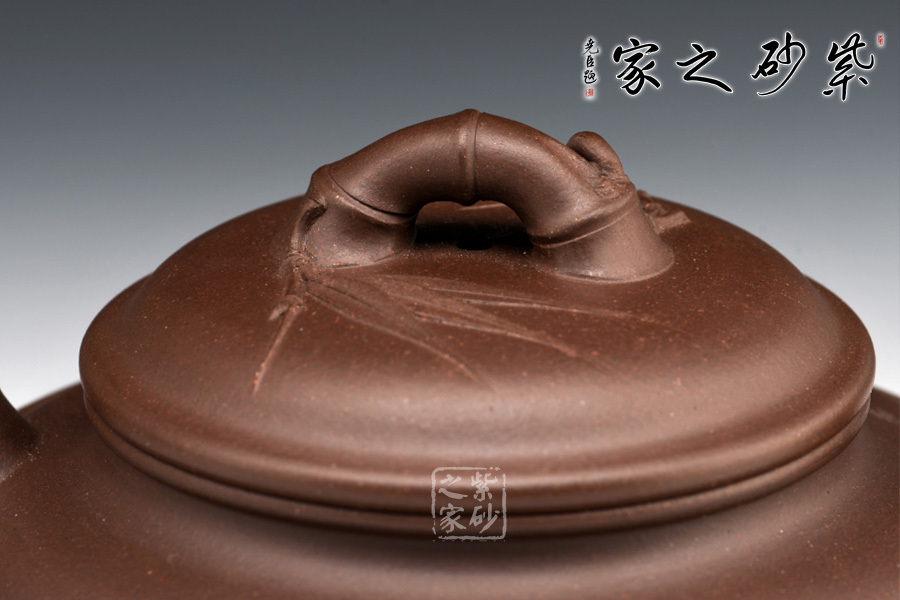 該壺底為盤狀,竹形鼓身,壺身雙線,飽滿有力。凹肩,長頸,口蓋子母線,虛蓋相配;一彎嘴,圓把,橋梁鈕,均塑以竹節(jié),蓋上貼飾竹葉,竹節(jié)剛勁挺拔,竹葉俊秀飄逸。