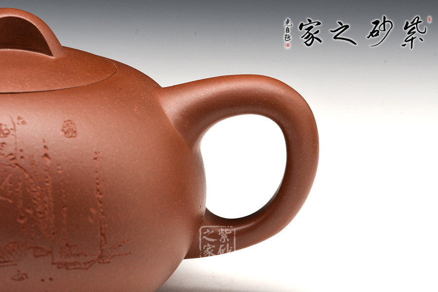 此作整體質(zhì)樸無華、典雅端莊,細(xì)看卻別致有趣,可愛喜人。壺身飽滿呈扁圓形,短粗彎流,圈形細(xì)把,兩者反差不顯突兀。壺鈕設(shè)計(jì)極為精巧,古樸典雅,與壺身結(jié)合比例和諧,文雅古樸,難能可貴。